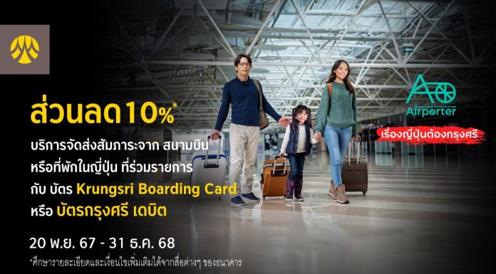 กรุงศรี (ธนาคารกรุงศรีอยุธยา จำกัด (มหาชน)) มอบสิทธิพิเศษสำหรับผู้ถือบัตร Krungsri Boarding Card และบัตรกรุงศรี เดบิต ทุกประเภท รับส่วนลด 10% เมื่อใช้บริการจาก Airporter จัดส่งสัมภาระจากสนามบิน โรงแรม หรือห้องพักในญี่ปุ่น ที่ร่วมรายการ โดยจองบริการผ่าน https://airporter.co.jp/ และระบุรหัสโปรโมชัน APKCC2425 พร้อมชำระด้วยบัตร Krungsri Boarding Card หรือบัตรกรุงศรี เดบิต ทุกประเภท ตั้งแต่วันที่ 20 พฤศจิกายน 2567 – 31 ธันวาคม 2568