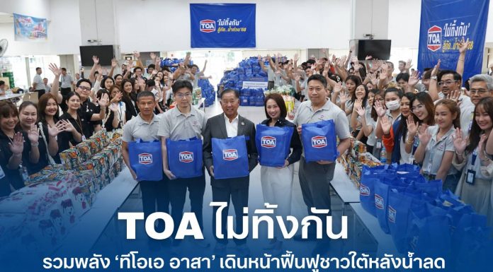 คุณประจักษ์ ตั้งคารวคุณ ประธานผู้ก่อตั้ง TOA และ ประธานมูลนิธิคุณแม่ลี้กิมเกียว ตั้งคารวคุณ เดินหน้าโครงการ TOA ไม่ทิ้งกัน ‘รวมพลังไทย ฟื้นฟูน้ำท่วมภาคใต้’ จัดเตรียมสิ่งของบรรเทาทุกข์ ถุงยังชีพ โดยได้รับความร่วมแรงร่วมใจจากผู้บริหาร และเพื่อนพนักงานทีโอเอจิตอาสากว่า 100 คน ร่วมกันบรรจุถุงยังชีพกว่า 2,000 ชุด ประกอบด้วย ข้าวสาร บะหมี่กึ่งสำเร็จรูป ปลากระป๋อง ถั่วมารูโจ้ น้ำยาทำความสะอาดทีโพล์ สเปรย์กำจัดแมลง เชนไดร้ท์ และสิ่งของจำเป็นอื่นๆ พร้อมทั้งจัดเตรียมผ้าห่มกันหนาว จำนวน 1,000...