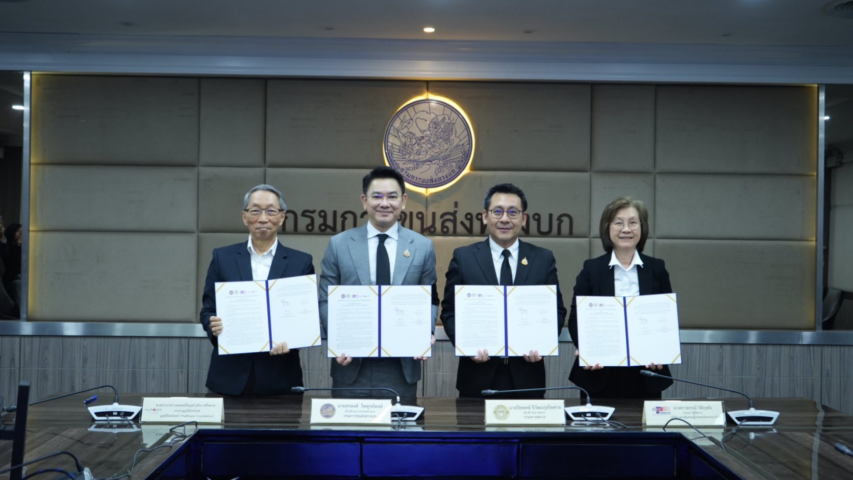 นายสรพงศ์ ไพฑูรย์พงษ์ อธิบดีกรมการขนส่งทางบก นายปิยพงษ์ จิวัฒนกุลไพศาล อธิบดีกรมทางหลวงนางสาวพรรณี ปิติกุลตัง กรรมการผู้จัดการบริษัท กลางคุ้มครองผู้ประสบภัยจากรถ จำกัด และ ศาสตราจารย์ นายแพทย์ไพบูลย์ สุริยะวงศ์ไพศาล ประธานมูลนิธิไทยโรดส์ ลงนามความร่วมมือการบูรณาการข้อมูลอุบัติเหตุทางถนน