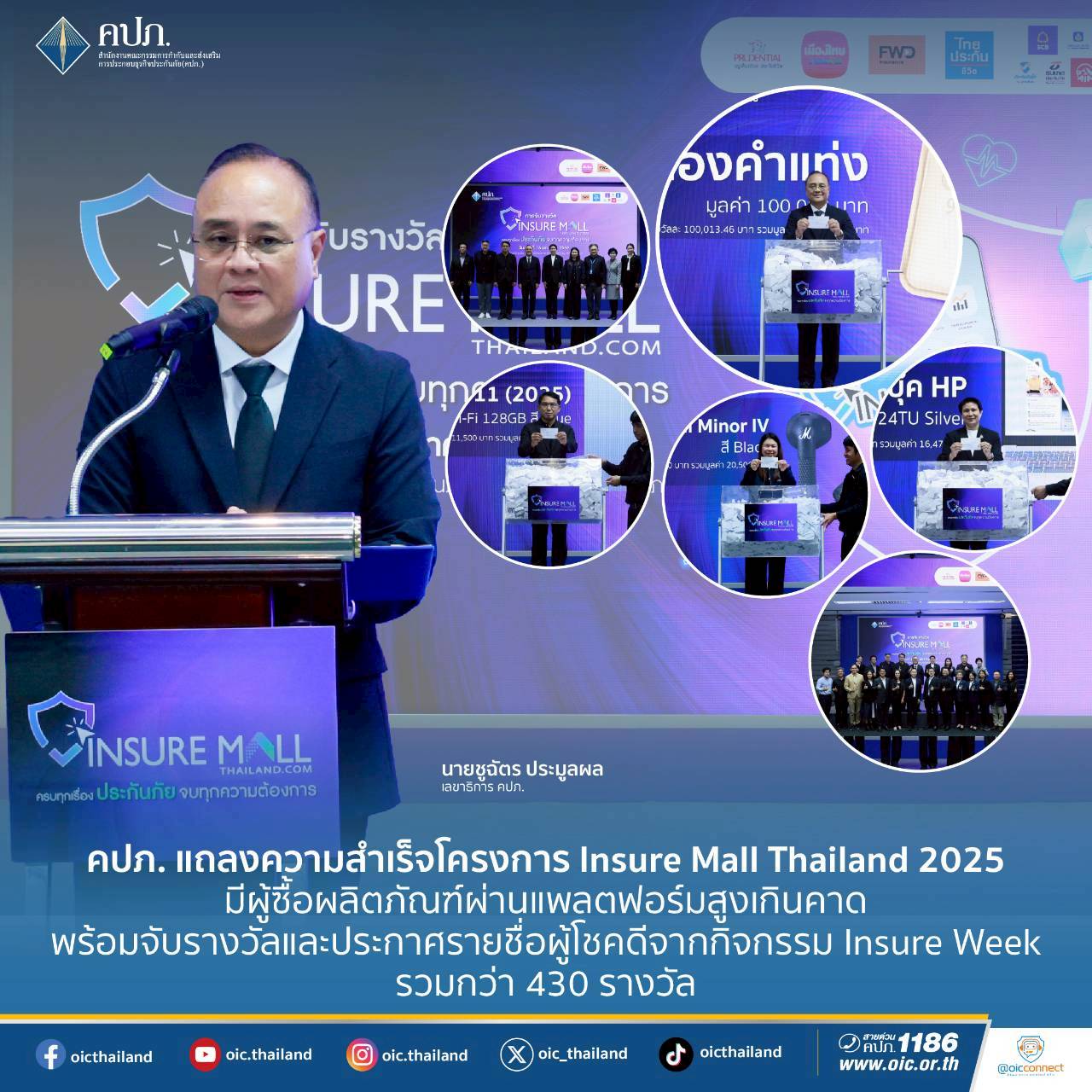 สำนักงาน คปภ. ขอแสดงความยินดีกับผู้โชคดีที่ซื้อผลิตภัณฑ์ประกันภัยในช่วงกิจกรรม Insure Week ผ่านเว็บไซต์ Insure Mall Thailand ระหว่างวันที่ 8 – 21 ธันวาคม 2568 ที่ผ่านมา ที่ได้รับสิทธิ์ลุ้นรางวัลใหญ่มูลค่ารวมกว่า 6 แสนบาท อาทิ ทองคำแท่ง และ iPhone 17 Pro รวมทั้งรางวัลอื่น ๆ อีกมากมาย รวมแล้วมากกว่า 430 รางวัล พร้อมกันนี้ ขอขอบคุณประชาชน ตลอดจนพันธมิตรและบริษัทประกันภัยที่ให้ความสนใจ และร่วมเป็นส่วนหนึ่งของความสำเร็จของโครงการ