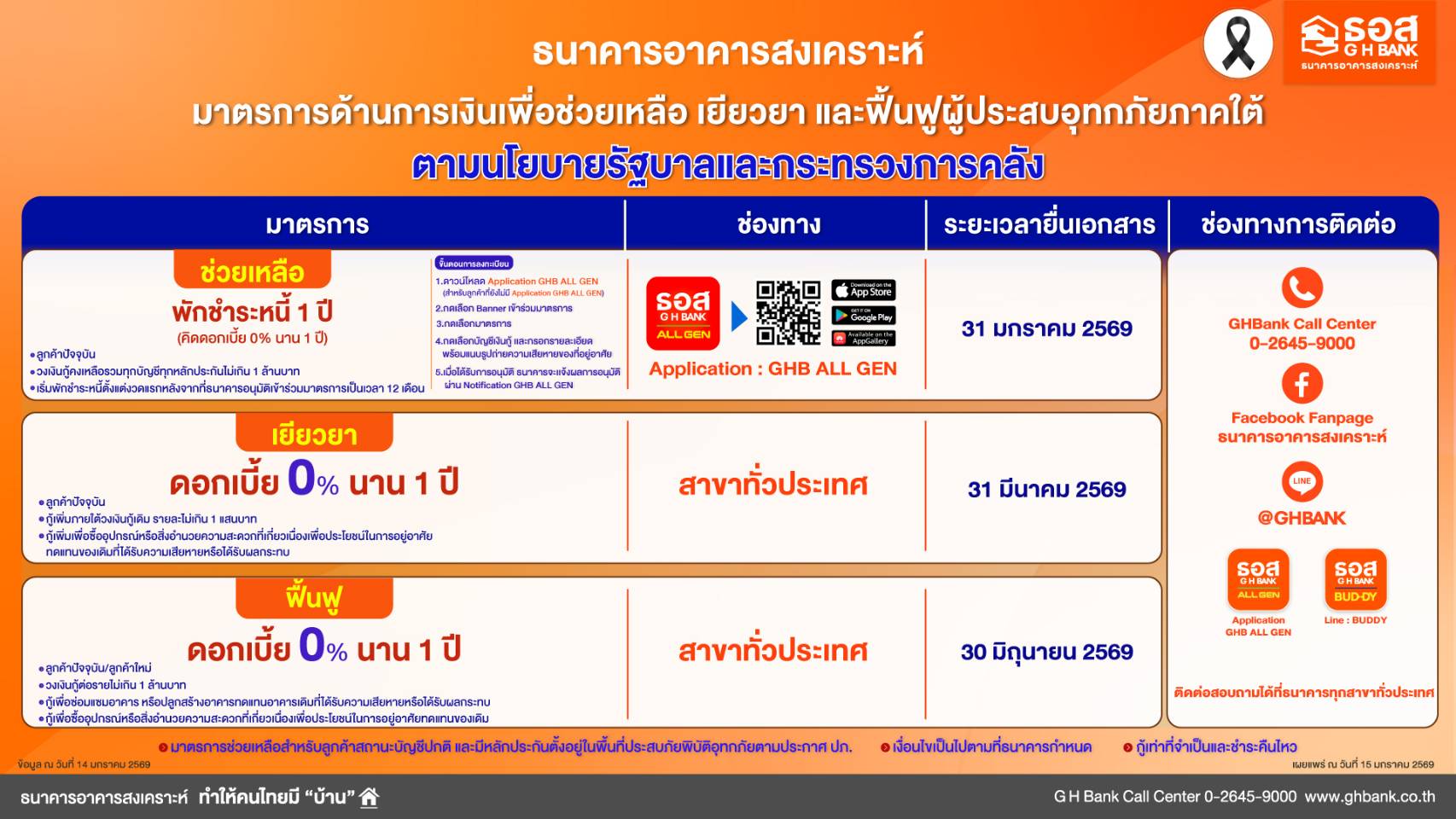 ในครั้งนี้ ต้องมีสถานะบัญชีปกติ ไม่เป็นหนี้ที่ไม่ก่อให้เกิดรายได้ (NPLs) และมีหลักประกันตั้งอยู่ในพื้นที่ประสบภัยพิบัติอุทกภัยตามประกาศกองอำนวยการกรมป้องกันและบรรเทาสาธารณภัย (ปภ.) ประกอบด้วย 10 จังหวัด 101 อำเภอ 591 ตำบล ได้แก่ ชุมพร นครศรีธรรมราช นราธิวาส ปัตตานี พัทลุง ยะลา ระนอง สงขลา สตูล และสุราษฎร์ธานี สำหรับลูกค้าที่มีความประสงค์เข้าร่วมโครงการช่วยเหลือฯ สามารถกด Banner ใน Application : GHB ALL GEN “มาตรการช่วยเหลือที่อยู่อาศัยที่ได้รับผลกระทบจากอุทกภัยพื้นที่ภาคใต้” บนหน้าจอหลัก เพื่อกรอกข้อมูลส่วนตัวและรายละเอียดความเสียหายของที่อยู่อาศัย พร้อมแนบหลักฐานความเสียหายเพื่อประกอบการพิจารณาให้ความช่วยเหลือ (เงื่อนไขเป็นไปตามที่ธนาคารกำหนด) และธนาคารจะเร่งตรวจสอบข้อมูลและแจ้งผลการพิจารณาอนุมัติเข้าร่วมมาตรการผ่านทางแอปพลิเคชันต่อไป ส่วนลูกค้าที่มีความประสงค์เข้าร่วมโครงการเยียวยาฯ และ โครงการฟื้นฟูฯ สามารถยื่นความประสงค์พร้อมหลักฐานความเสียหายของที่อยู่อาศัยเพื่อประกอบการพิจารณาให้ความช่วยเหลือ ณ สาขาธนาคารทั่วประเทศ สอบถามรายละเอียดเพิ่มเติมได้ที่ G H Bank Call Center โทร 0-2645-9000 และติดตามข่าวสารของธนาคารได้ที่ G H Bank Social Media ทุกช่องทาง