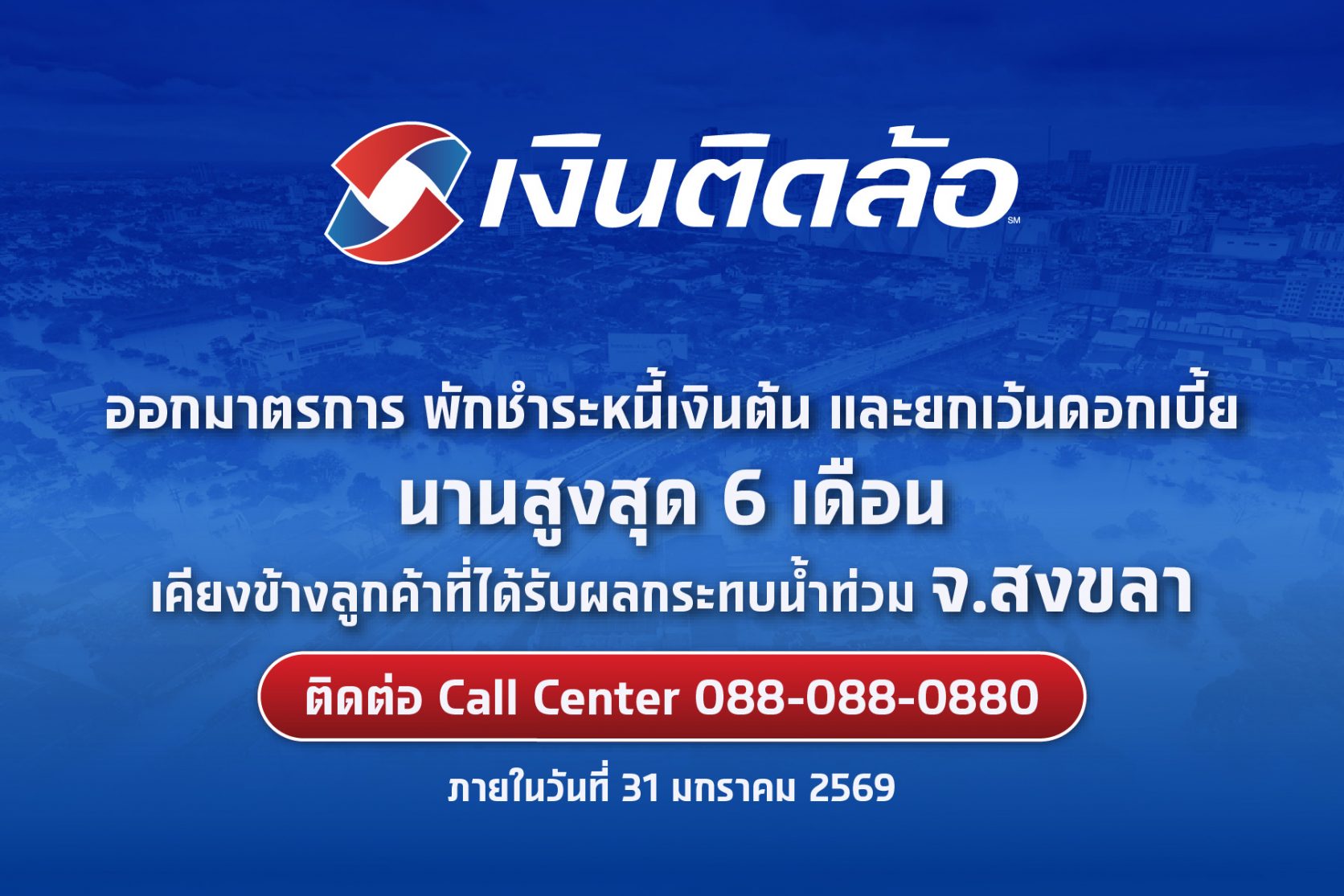 “เงินติดล้อ” ออกมาตรการพักชำระหนี้เงินต้นและยกเว้นดอกเบี้ย ให้กับลูกค้าสินเชื่อที่ได้รับผลกระทบจากเหตุการณ์น้ำท่วมในพื้นที่ จ.สงขลา เป็นระยะเวลานานสูงสุด 6 เดือน โดยลูกค้าสินเชื่อที่ได้รับผลกระทบจากน้ำท่วมในพื้นที่ จ.สงขลา สามารถติดต่อสอบถามมาตรการพักชำระหนี้ภายในวันที่ 31 มกราคม 2569 หรือสอบถามรายละเอียดเพิ่มเติมได้ที่ Call Center หมายเลขโทรศัพท์ 088-088-0880 ตลอด 24 ชม.