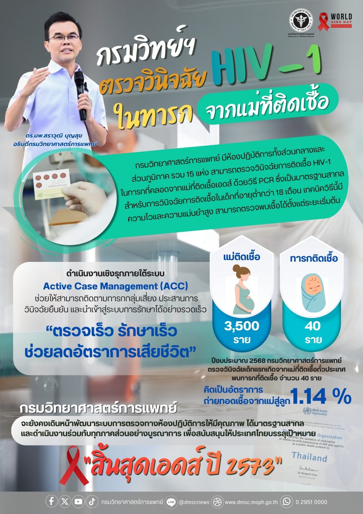 ทั้งนี้ นโยบายของกระทรวงสาธารณสุข กำหนดให้เด็กที่เกิดจากแม่ที่ติดเชื้อเอชไอวีทุกราย ต้องตรวจหาการติดเชื้อเอชไอวี ในส่วนของกรมวิทยาศาสตร์การแพทย์ซึ่งมีห้องปฏิบัติการทั้งส่วนกลางและส่วนภูมิภาค รวม 15 แห่ง สามารถตรวจวินิจฉัยการติดเชื้อ HIV-1 ในทารกที่คลอดจากแม่ที่ติดเชื้อเอดส์ ด้วยวิธี PCR ซึ่งเป็นมาตรฐานสากลสำหรับการวินิจฉัยการติดเชื้อในเด็กที่อายุต่ำกว่า 18 เดือน เทคนิควิธีนี้มีความไวและความแม่นยำสูง สามารถตรวจพบเชื้อได้ตั้งแต่ระยะเริ่มต้น ซึ่งการตรวจวินิจฉัยที่รวดเร็ว เป็นปัจจัยสำคัญที่ช่วยให้เด็กได้รับการรักษาอย่างทันท่วงที ส่งผลต่อการลดอัตราการเสียชีวิตของเด็กที่ติดเชื้อได้อย่างมีนัยสำคัญ ทั้งนี้ในปีงบประมาณ 2568 มีหญิงตั้งครรภ์ที่ติดเชื้อ 3,500 ราย กรมวิทยาศาสตร์การแพทย์ได้ตรวจวินิจฉัยเด็กแรกเกิดจากแม่ที่ติดเชื้อ พบทารกที่ติดเชื้อ จำนวน 40 ราย (คิดเป็นอัตราการถ่ายทอดเชื้อจากแม่สู่ลูกร้อยละ 1.14)