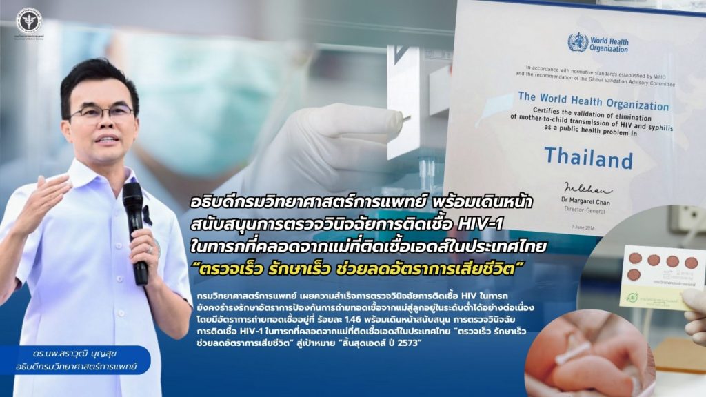 กรมวิทยาศาสตร์การแพทย์ เผยความสำเร็จการตรวจวินิจฉัยการติดเชื้อ HIV ในทารก ยังคงธำรงรักษาอัตราการป้องกันการถ่ายทอดเชื้อจากแม่สู่ลูกอยู่ในระดับต่ำได้อย่างต่อเนื่อง พร้อมเดินหน้าสนับสนุน การตรวจวินิจฉัยการติดเชื้อ HIV-1 ในทารกที่คลอดจากแม่ที่ติดเชื้อเอดส์ในประเทศไทย “ตรวจเร็ว รักษาเร็ว ช่วยลดอัตราการเสียชีวิต” สู่เป้าหมาย “สิ้นสุดเอดส์ ปี 2573”