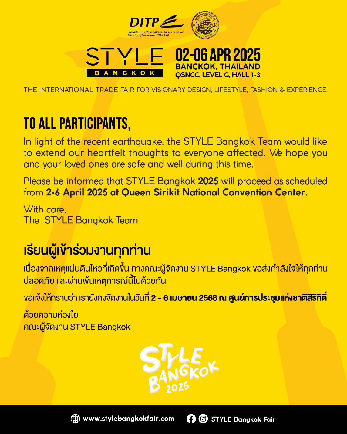 จากเหตุการณ์แผ่นดินไหว เมื่อวันที่ 28 มีนาคม 2568 ที่ส่งแรงสั่นสะเทือนถึงประเทศไทย และอาจสร้างความวิตกกังวลต่อผู้ซื้อจากทั้งไทยและต่างประเทศ กรมส่งเสริมการค้าระหว่างประเทศ สภาหอการค้าแห่งประเทศไทย และคณะผู้จัดงานฯ ประกาศยืนยันสถานการณ์ได้กลับสู่สภาวะปกติ และพร้อมเดินหน้าจัดงาน STYLE Bangkok 2025 ระหว่างวันที่ 2-6 เมษายนนี้ ที่ศูนย์การประชมแห่งชาติสิริกิติ์ ตามกำหนดเดิม