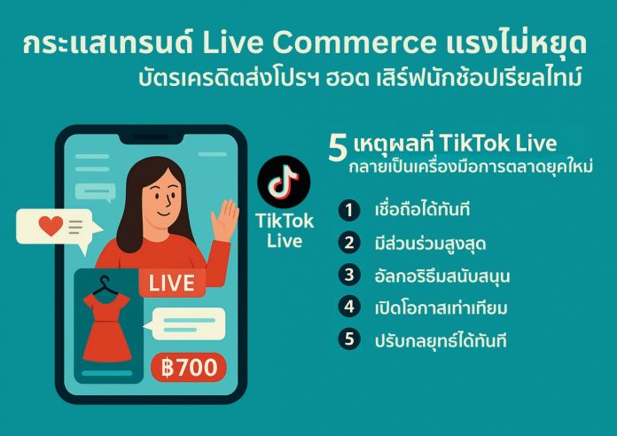 ในยุคที่ “ทุกวินาทีคือจังหวะการขาย” แพลตฟอร์ม TikTok ไม่ได้เป็นเพียงพื้นที่สร้างความบันเทิงอีกต่อไป แต่ได้กลายเป็น “เวทีค้าขายแบบเรียลไทม์” หรือ Live Commerce ที่พลิกพฤติกรรมผู้บริโภคและสร้างเศรษฐกิจใหม่ให้แบรนด์และครีเอเตอร์ทั่วประเทศ พร้อมมีการเติบโตขึ้นอย่างต่อเนื่อง ซึ่ง TikTok Shop ติดอันดับ 1 ใน 3 ของแพลตฟอร์มช้อปออนไลน์ยอดนิยม โดยข้อมูลในพอร์ตการใช้จ่ายผ่านบัตรเคทีซี สมาชิกมีการใช้จ่ายบน TikTok Shop เฉลี่ยเกือบ 6 ครั้งต่อคนต่อเดือน