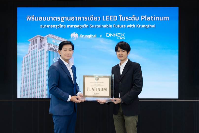 นายบวรสันติ์ นวราช กรรมการผู้จัดการ บริษัท เอสซีจี บิลดิ้ง แอนด์ ลิฟวิ่งแคร์คอนซัลติ้ง จำกัด จาก ONNEX by SCG (ที่ 5 จากขวา) ร่วมแสดงความยินดีในพิธีมอบป้ายมาตรฐานอาคารเขียว “LEED (Leadership in Energy and Environmental Design)” ให้แก่ ธนาคารกรุงไทย อาคารสำนักงานใหญ่ สุขุมวิท นำโดย คุณพิชิตศักดิ์ ศิริปัญจนะ ผู้บริหารสายงาน ปฏิบัติการธนาคารกรุงไทย (ที่ 6 จากซ้าย) หลังประสบความสำเร็จผ่านการรับรองมาตรฐานอาคารเขียว LEED เวอร์ชันล่าสุด 4.1 ประเภท O+M ในระดับ Platinum ซึ่งเป็นระดับสูงสุด ที่มุ่งเน้นด้านการดูแลและปรับปรุงประสิทธิภาพของอาคารที่มีอยู่เดิม ให้ลดการใช้ทรัพยากรและการปล่อยก๊าซเรือนกระจกได้จริง และสร้างคุณภาพอากาศภายในอาคารที่ดีแก่ผู้ใช้งาน เพื่อดำเนินการตามเป้าหมายการมุ่งสู่ Net Zero ของธนาคารกรุงไทยในภาพรวม โดยมีผู้เชี่ยวชาญจากทาง ONNEX by SCG เป็นบริษัทที่ปรึกษาการขอรับรองมาตรฐานในครั้งนี้ ต่อเนื่องจากปี 2567 ที่อาคารสำนักงานใหญ่ นานาเหนือ ได้รับรางวัล LEED ในระดับ Gold จากสถาบัน U.S. Green Building Council (USGBC) มาก่อนหน้า
