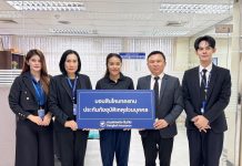 นายสมพงษ์ มากมณี รองผู้ว่าราชการจังหวัดนครศรีธรรมราช รองผู้อำนวยการศูนย์อำนวยการจิตอาสาพระราชทาน จังหวัดนครศรีธรรมราช (คนที่ 3 จากขวา) รับมอบน้ำดื่มจำนวน 1,000 ขวด จาก บมจ.กรุงไทย-แอกซ่า ประกันชีวิต โดย คุณอัญรินทร์ วุฒิมนตรีภัสร์ ผู้อำนวยการธุรกิจ ฝ่ายตัวแทน สำนักงาน 80J จังหวัดนครศรีธรรมราช (คนที่ 3 จากซ้าย) พร้อมตัวแทนในพื้นที่จังหวัดนครศรีธรรมราช ร่วมส่งมอบน้ำดื่ม พร้อมส่งกำลังใจ ให้แก่ผู้ประสบอุทกภัยในจังหวัดนครศรีธรรมราช