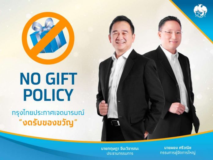 นายกฤษฎา จีนะวิจารณะ ประธานกรรมการ ธนาคารกรุงไทย และนาย ผยง ศรีวณิช กรรมการผู้จัดการใหญ่ แสดงเจตนารมณ์ร่วมโครงการ NO Gift Policy งดรับของขวัญ ในเทศกาลวันปีใหม่ 2564 และในทุกเทศกาล