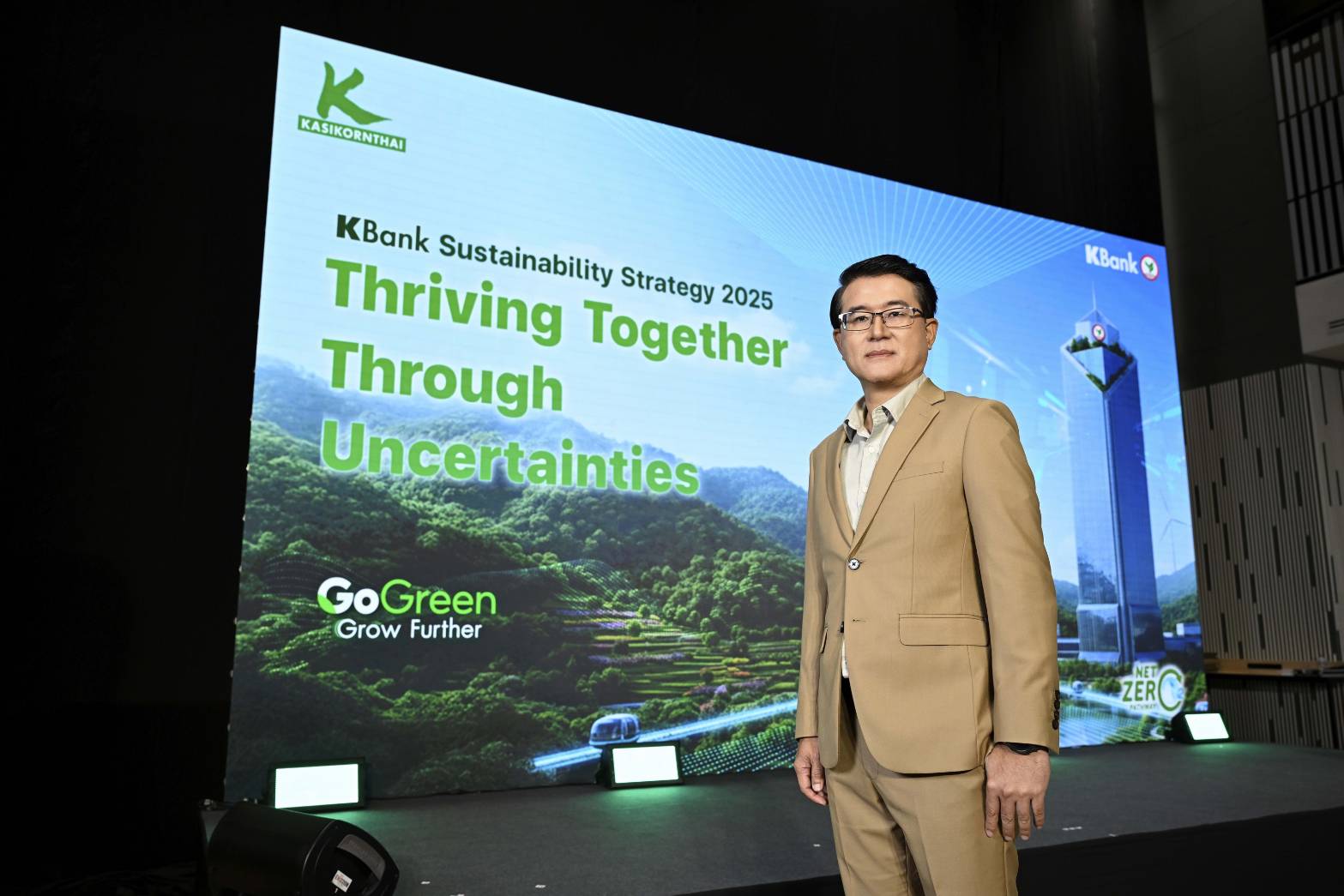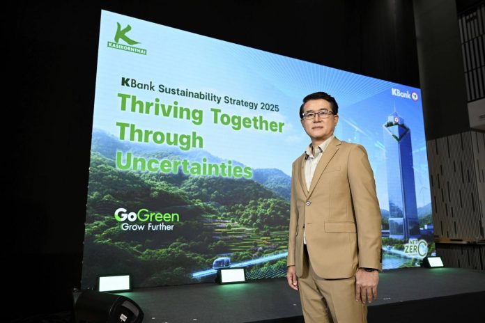 Mr. Chongrak Rattanapian, President of KASIKORNBANK, held a press conference titled “KBank Sustainability Strategy 2025: Thriving Together Through Uncertainties”, announcing a refinement of its sustainability strategy, shifting focus from the traditional ESG framework to a holistic, issue-based strategy that integrates three key management priorities: Be a Most Trusted Bank, Reinforce Future-Ready Resilience, and Enable Inclusive Growth. The bank also raised its sustainable finance and investment target to Baht 400–500 billion by 2030, with the commitment to become the “Most Comprehensive Climate Solution Provider”. The press conference was held recently at KASIKORNBANK Headquarters, Phahonyothin Building.