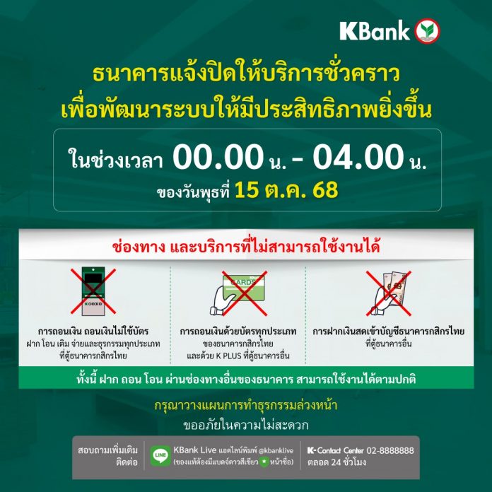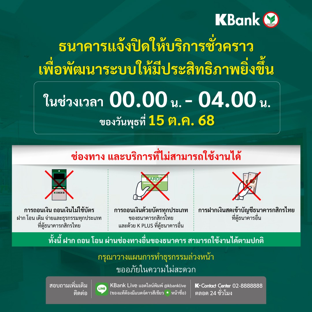 กสิกรไทยแจ้งปิดให้บริการชั่วคราว เป็นเวลา 4 ชั่วโมง ช่วง 00.00-04.00 น. ของ 15 ต.ค. 68