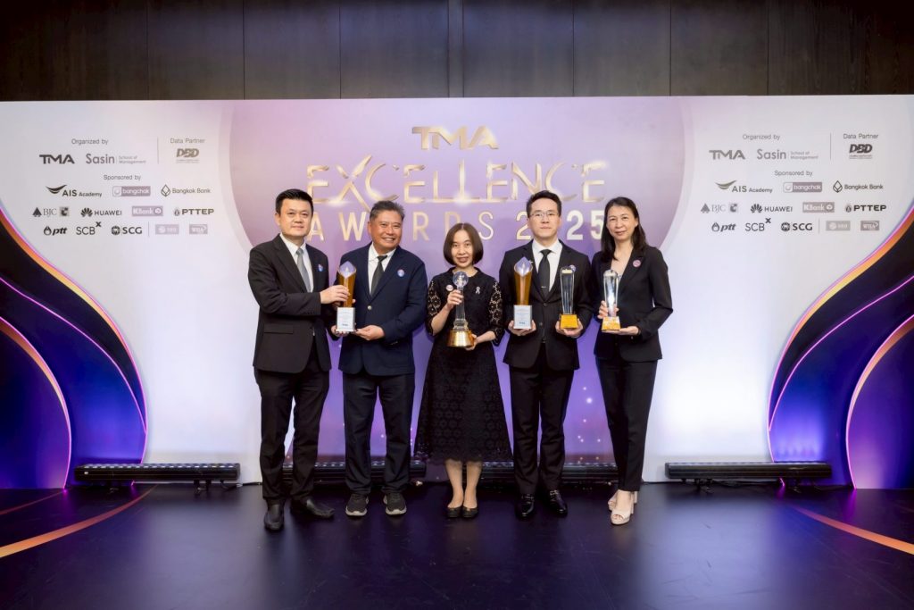 พร้อมด้วยนายชลัฐ ศิริพงศ์วุฒิกร (ที่ 2 จากขวา) รองผู้จัดการใหญ่ ธนาคารกสิกรไทย เป็นผู้แทนธนาคารร่วมรับมอบรางวัล SMEs Excellence Awards 2025 ได้แก่ รางวัลพระราชทานในสมเด็จพระกนิษฐาธิราชเจ้า กรมสมเด็จพระเทพรัตนราชสุดา ฯ สยามบรมราชกุมารี รางวัลประเภทธุรกิจบริการ ซึ่งธนาคารได้รับร่วมกับบริษัท วินด์ชิลล์ จำกัด ในงานประกาศผลรางวัล TMA Excellence Awards 2025 จัดโดยสมาคมการจัดการธุรกิจแห่งประเทศไทย (TMA) ร่วมกับสถาบันบัณฑิตบริหารธุรกิจศศินทร์ แห่งจุฬาลงกรณ์มหาวิทยาลัย ณ โรงแรมวอลดอร์ฟ แอสโทเรีย กรุงเทพฯ เมื่อเร็ว ๆ นี้