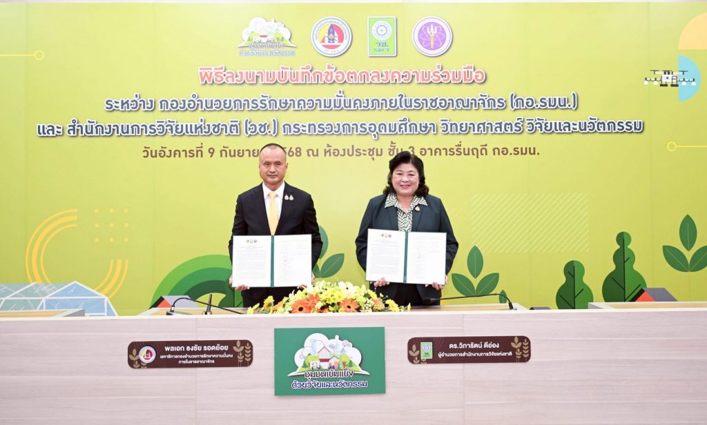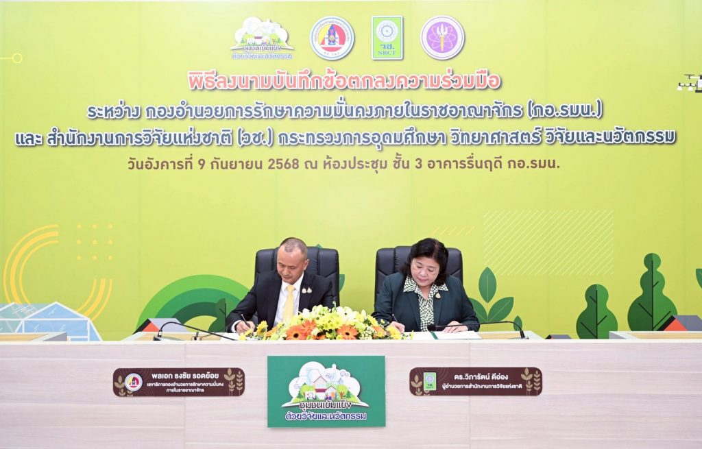 วันที่ 9 กันยายน 2568 กองอำนวยการรักษาความมั่นคงภายในราชอาณาจักร(กอ.รมน.) ร่วมกับ สำนักงานการวิจัยแห่งชาติ(วช.) กระทรวงการอุดมศึกษา วิทยาศาสตร์ วิจัยและนวัตกรรม จัดพิธีลงนามบันทึกข้อตกลงความร่วมมือการใช้ประโยชน์องค์ความรู้จากผลงานวิจัยและนวัตกรรมเพื่อการพัฒนาเชิงพื้นที่ : ชุมชนเข้มแข็งด้วยวิจัยและนวัตกรรม ณ ห้องประชุม ชั้น 3 อาคารรื่นฤดี กอ.รมน.