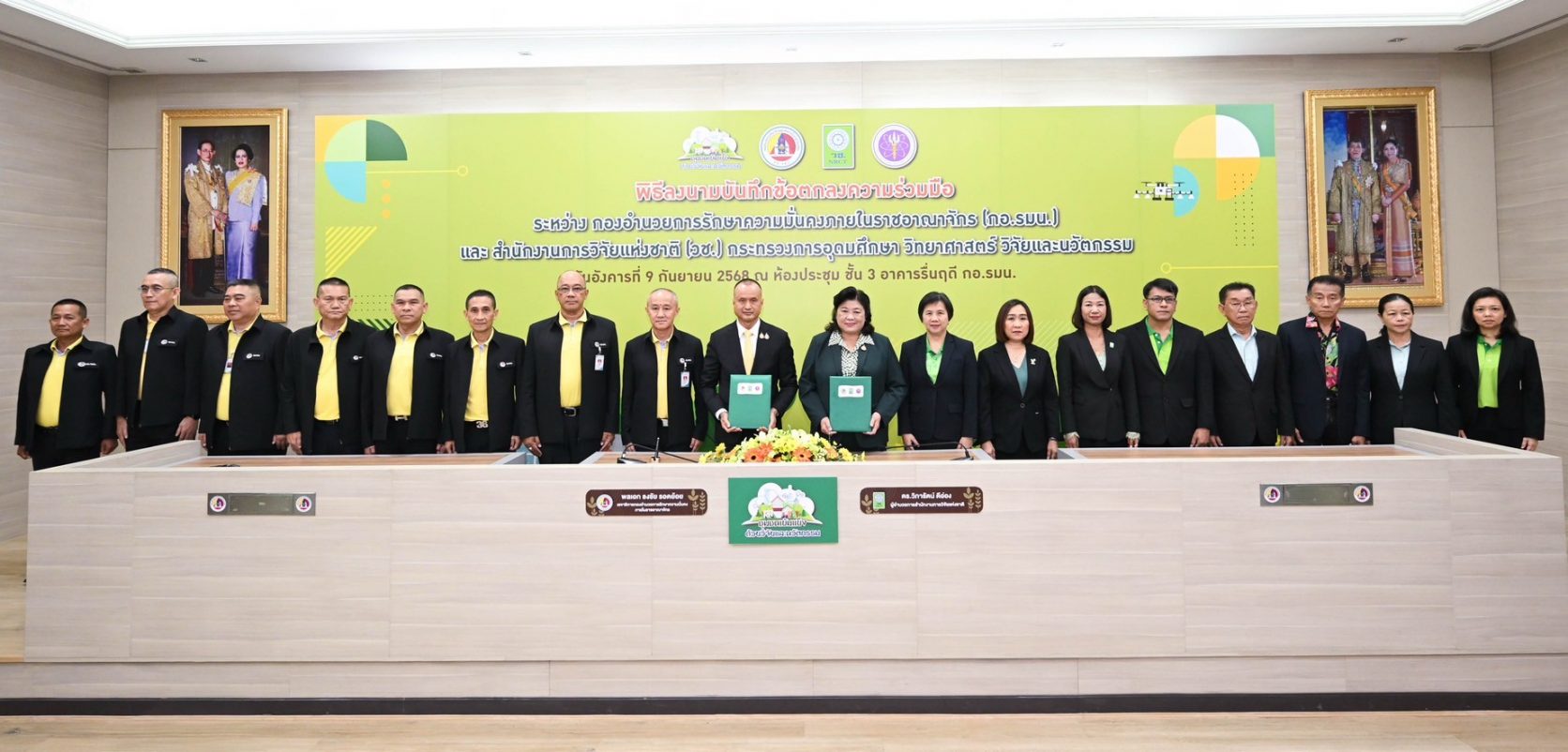 วันที่ 9 กันยายน 2568 กองอำนวยการรักษาความมั่นคงภายในราชอาณาจักร(กอ.รมน.) ร่วมกับ สำนักงานการวิจัยแห่งชาติ(วช.) กระทรวงการอุดมศึกษา วิทยาศาสตร์ วิจัยและนวัตกรรม จัดพิธีลงนามบันทึกข้อตกลงความร่วมมือการใช้ประโยชน์องค์ความรู้จากผลงานวิจัยและนวัตกรรมเพื่อการพัฒนาเชิงพื้นที่ : ชุมชนเข้มแข็งด้วยวิจัยและนวัตกรรม ณ ห้องประชุม ชั้น 3 อาคารรื่นฤดี กอ.รมน.