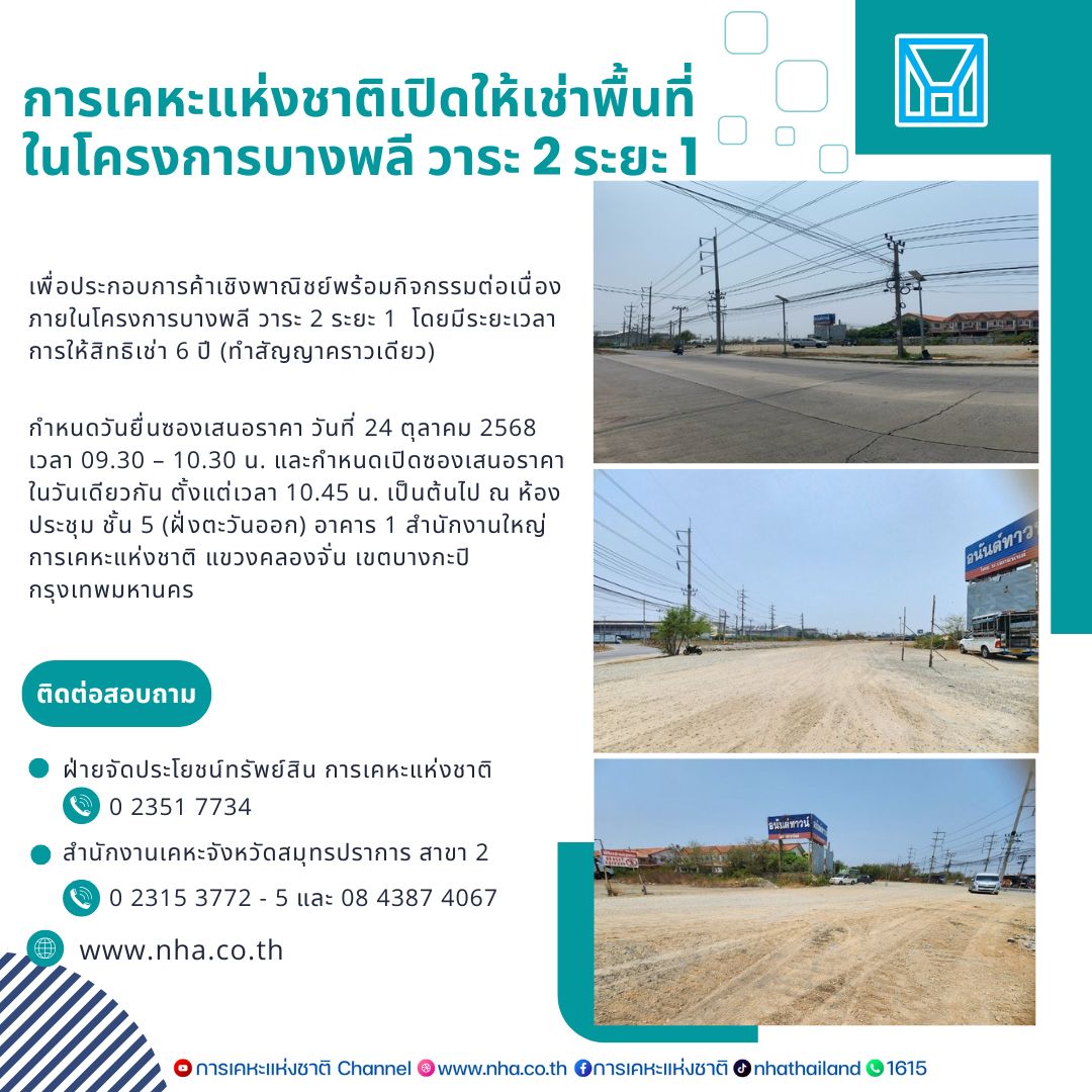 นายอรรคพล ภิรมย์ประดิษฐ์ ผู้อำนวยการฝ่ายจัดประโยชน์ทรัพย์สิน กล่าวว่า การเคหะแห่งชาติ เปิดให้เอกชนยื่นซองเสนอราคาค่าธรรมเนียมการได้สิทธิเช่าที่ดินแปลงว่าง เพื่อประกอบการค้าเชิงพาณิชย์พร้อมกิจกรรมต่อเนื่อง ภายในโครงการบางพลี วาระ 2 ระยะ 1 ตั้งอยู่ที่ติดถนนทางหลวงชนบท สป.1006 อำเภอบางเสาธง จังหวัดสมุทรปราการ บางส่วนของโฉนดที่ดินเลขที่ 16077 ขนาดเนื้อที่ประมาณ 3-3-33 ไร่ (1,533 ตารางวา) เพื่อให้เกิดความโปร่งใสในการดำเนินงานทุกขั้นตอนตามหลักธรรมาภิบาล การเคหะแห่งชาติจึงเปิดโอกาสให้เอกชนที่สนใจสามารถยื่นข้อเสนอราคาการได้สิทธิเช่าที่ดินดังกล่าว