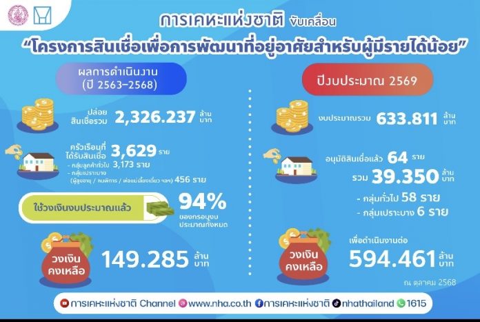 พร้อมกันนี้ การเคหะแห่งชาติเตรียมยกระดับการบริหารจัดการอาคารเช่ากว่า 66,000 หน่วย เพื่อพัฒนาคุณภาพการให้บริการ การดูแลรักษา และสภาพแวดล้อมโดยรอบให้ได้มาตรฐาน สร้างความมั่นคงในการอยู่อาศัยให้กับพี่น้องประชาชนในระยะยาว ตลอดจนเดินหน้าโครงการสินเชื่อเพื่อการพัฒนาที่อยู่อาศัย และปล่อยสินเชื่อแล้วกว่า 2,300 ล้านบาท ในปี 2569 การเคหะแห่งชาติได้จัดเตรียมวงเงินเพื่อปล่อยสินเชื่อให้กับประชาชนเพิ่มเติมอีกมากกว่า 594 ล้านบาท เพื่อรองรับความต้องการด้านที่อยู่อาศัย โดยเฉพาะในกลุ่มพี่น้องประชาชนที่ถูกปฏิเสธสินเชื่อจากสถาบันการเงิน เพื่อเพิ่มโอกาสและช่องทางในการเข้าถึงที่อยู่อาศัยให้ได้มากที่สุด ด้านการพัฒนาชุมชน การเคหะแห่งชาติมุ่งมั่นขับเคลื่อนโมเดล BCG และ ESG ใน 35 ชุมชนทั่วประเทศ เพื่อส่งเสริมการจัดการขยะ ลดมลภาวะ เพิ่มพื้นที่สีเขียว และสร้างความร่วมมือในชุมชนให้เข้มแข็งและยั่งยืน