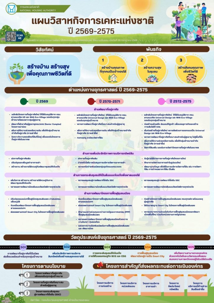 นายทวีพงษ์ วิชัยดิษฐ ผู้ว่าการการเคหะแห่งชาติ เปิดเผยว่า องค์กรกำลังเดินหน้าตามแนวคิด “Go Green & Growth Together for All with Innovation” ผ่านกระบวนการพัฒนาที่อยู่อาศัยมาตรฐานมากกว่า 21,000 หน่วยทั่วประเทศ โดยยึดแนวคิด Universal Design, NHA Eco-Village และการพัฒนาโครงการนำร่อง Senior Complex รองรับการอยู่อาศัยสำหรับผู้สูงอายุแบบครบวงจร เพื่อให้ประชาชนทุกกลุ่มเป้าหมายสามารถเข้าถึงที่อยู่อาศัยคุณภาพได้อย่างเท่าเทียม นอกจากนี้ยังมีการพัฒนาที่อยู่อาศัยร่วมกับสำนักงานคณะกรรมการการศึกษาขั้นพื้นฐาน (สพฐ.) พัฒนาบ้านพักครู ได้แก่ โรงเรียนหนองหล่มวิทยาคาร จังหวัดเชียงใหม่, โรงเรียนกิตติญาณอุปถัมภ์ จังหวัดอุบลราชธานี, โรงเรียนบ้านคลองห้วยทราย จังหวัดกำแพงเพชร, โรงเรียนบ้านตางาม จังหวัดตราด, โรงเรียนบ้านแจงงาม จังหวัดกาญจนบุรี, คลังดอนเมือง จังหวัดปทุมธานี, โรงเรียนบ้านเมืองพรึก จังหวัดอุดรธานี, อาคาร สปอ จังหวัดสุราษฎร์ธานี, โรงเรียนวัดมกุฎกษัตริยาราม และโรงเรียนเจ้าพระยาวิทยาคม กรุงเทพมหานคร เป็นต้น เพื่อเสริมสวัสดิการด้านที่อยู่อาศัยให้กับข้าราชการครูและบุคลากรทางการศึกษาในพื้นที่ที่มีความจำเป็นเร่งด่วน