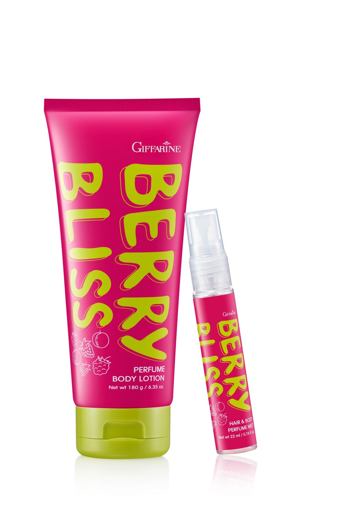 บริษัท กิฟฟารีน สกายไลน์ ยูนิตี้ จำกัด แนะนำกลุ่มผลิตภัณฑ์บำรุงผิวกาย และสเปรย์น้ำหอม สำหรับผิวกายและเส้นผม กิฟฟารีน เบอร์รี่ บลิส เพอร์ฟูม บอดี้ โลชั่น (Giffarine Berry Bliss Perfume Body Lotion) ขนาดบรรจุ 180 กรัม ราคา 299 บาท ที่ช่วยบูสต์ผิวใส อัพผิวหอมตลอดวัน โลชั่นเนื้อเบา สบายผิว ด้วยสารบำรุงจัดเต็มทั้ง Powerful Vitamin C, Vitamin B3 ,7 Flowers Extract, Shea Butter และ Vitamin E ให้ผิวเนียน นุ่ม ชุ่มชื้น กระจ่างใส น่ากอดสุดๆ และกิฟฟารีน เบอร์รี่ บลิส แฮร์ แอนด์ บอดี้ เพอร์ฟูม มิสท์ (Giffarine Berry Bliss Hair & Body Perfume Mist) ขนาดบรรจุ 22.00 มิลลิลิตร ราคา 99 บาท สเปรย์น้ำหอมที่ฉีดได้ทั้งผมและผิวในขวดเดียว เพราะหอมสดใสแบบ 2 in 1 แนว Fruity Floral ทัชใจวัยรุ่นมาก หอมติดทนนาน พกพาสะดวก เพิ่มความมั่นใจได้ทุกครั้ง ทุกที่ ทุกเวลาที่ต้องการ สายชาบู สายปิ้งย่าง และสายหลังออกกำลังกายต้องมี!! สินค้าใหม่แกะกล่อง “Berry Bliss” ที่สาวๆ ไม่ควรพลาดกับ 2 ไอเทมเด็ด