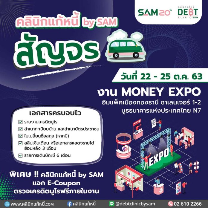 นายนิยต มาศะวิสุทธิ์ กรรมการผู้จัดการ บริษัท บริหารสินทรัพย์สุขุมวิท จำกัด (บสส.) หรือ SAM เผยว่า “คลินิกแก้หนี้ by SAM” สัญจรเชิงรุกอย่างต่อเนื่อง เพื่อช่วยแก้ไขปัญหาหนี้เสียสารพัดบัตร และสินเชื่อส่วนบุคคลที่ไม่มีหลักประกันกับธนาคารพาณิชย์และผู้ประกอบธุรกิจทางการเงิน (Non-Bank) โดยจัดเจ้าหน้าที่ให้คำปรึกษาและรับสมัครผู้ที่มีปัญหาหนี้เสียสารพัดบัตร และสินเชื่อส่วนบุคคลที่ไม่มีหลักประกัน ในงาน Money Expo ระหว่างวันที่ 22-25 ตุลาคม 2563 ที่ชาเลนเจอร์ฮอลล์ 1-2 ภายในบูธธนาคารแห่งประเทศไทย N 7 อิมแพ็คเมืองทองธานี กรุงเทพฯ พิเศษ! สำหรับผู้ที่ยังไม่มีเอกสารรายงานเครดิตบูโร รับสิทธิ์ตรวจเครดิตบูโรได้ฟรี ผู้สนใจสมัครเข้าโครงการคลินิกแก้หนี้ ต้องมีคุณสมบัติเบื้องต้นตามที่กำหนด คือ เป็นบุคคลธรรมดาที่มีรายได้ อายุไม่เกิน 65 ปี และ เป็นหนี้เสียก่อน 1 กรกฎาคม 2563 ทั้งนี้ เพื่อความรวดเร็วในการพิจารณาและรู้ผลการสมัครได้ทันทีตามแนวคิด “เอกสารครบ-จบไว” ควรเตรียมเอกสารสำคัญมายื่นในงาน ดังนี้ 1. สำเนาบัตรประชาชนและสำเนาทะเบียนบ้าน 2. สลิปเงินเดือนย้อนหลัง หรือเอกสารแสดงรายได้ย้อนหลัง 3 เดือน 3. รายการเดินบัญชี หรือ Statement ย้อนหลัง 6 เดือน 4. เอกสารรายงานเครดิตบูโร โดยผู้ที่ได้รับอนุมัติให้ผ่านเข้าโครงการจะได้รับดอกเบี้ยที่ต่ำเพียง 4-7% ต่อปี รวมถึงได้ระยะเวลาในการผ่อนชำระนานสูงสุดถึง 10 ปีอีกด้วย รายละเอียดเพิ่มเติมสอบถามได้ที่ Call Center 02-610-2266 ทุกวันจันทร์-ศุกร์ เวลา 8.30-17.00 น. หรือสมัครผ่านช่องทางออนไลน์ ทั้งเว็บไซต์ www.คลินิกแก้หนี้.com หรือ แอดไลน์ @debtclinicbysam และ Facebook คลินิกแก้หนี้ รวมทั้งติดตามข้อมูลและเกร็ดความรู้ดี ๆ ได้ที่ Debtclinicbysam บน YouTube และล่าสุดบน Twitter