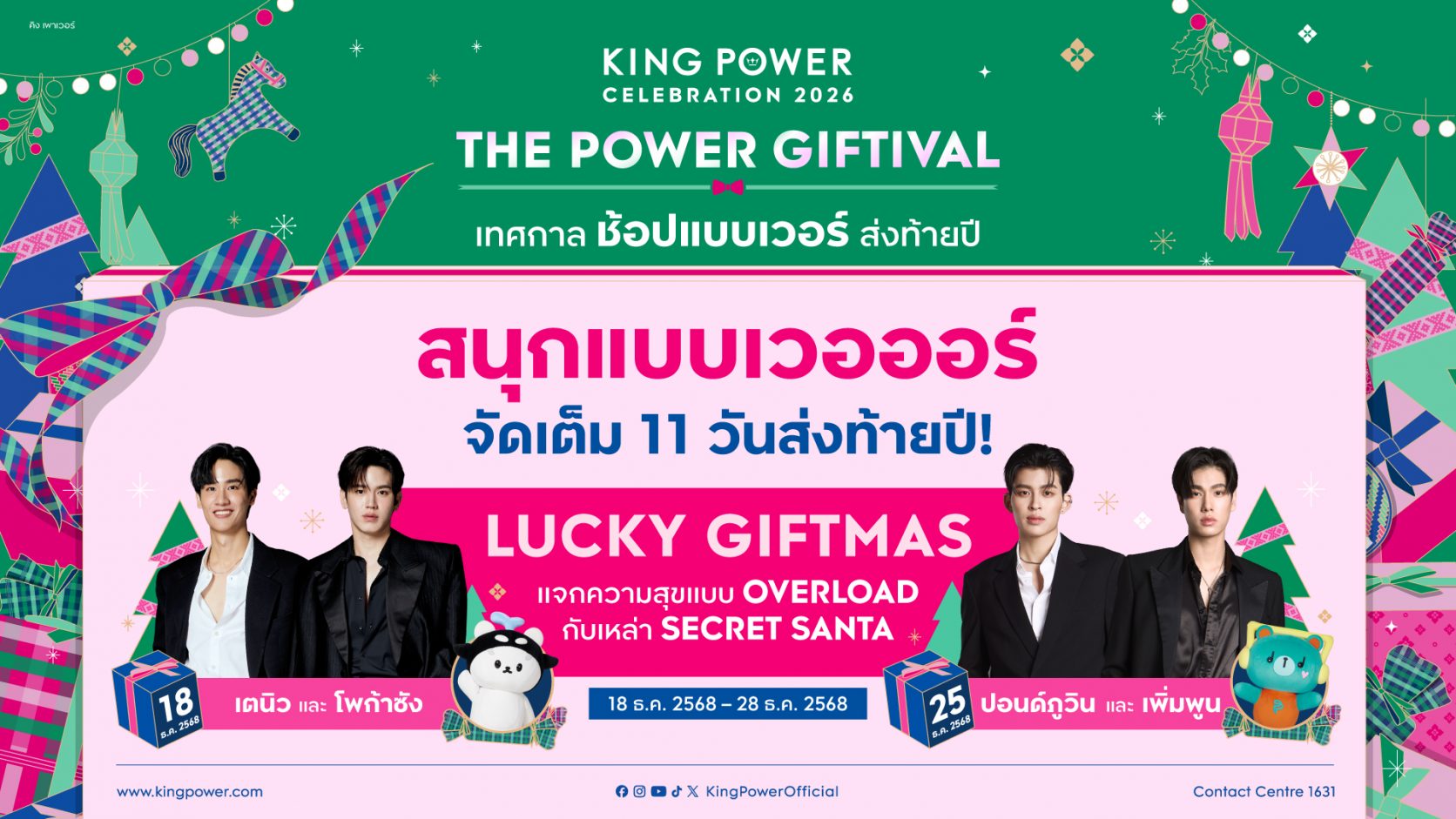 คิง เพาเวอร์ ต้อนรับเทศกาลแห่งความสุข ชวน 2 คู่สุดฮอตและลูก ๆ ร่วมกิจกรรม LUCKY GIFTMAS ในงาน “KING POWER CELEBRATION 2026 THE POWER GIFTIVAL เทศกาล ช้อปแบบเวอร์ ส่งท้ายปี” วันที่ 18 ธันวาคม 2568 พบกับ เต ตะวัน-นิว ฐิติภูมิและโพก้าซัง วันที่ 25 ธันวาคม 2568 พบกับปอนด์ ณราวิชญ์ – ภูวินทร์ และเพิ่มพูน มอบสิทธิพิเศษเฉพาะสมาชิก POWER PASS ช้อปสินค้าครบทุก ๆ 500 บาท (เฉพาะวันที่ 18 และ 25 ธันวาคม 2568) รับ 1 สิทธิ์ ร่วมสนุกเป็น 1 ใน 50 ผู้โชคดี ร่วมกิจกรรมสุดเอกซ์คลูซิฟกับศิลปินคนโปรด ที่ คิง เพาเวอร์ รางน้ำ