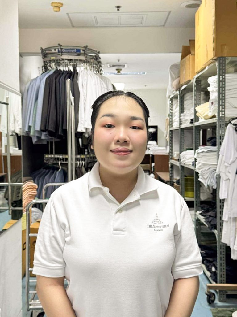 เนย ทำงานในแผนกแม่บ้าน ดูแลเรื่องลินิน ยูนิฟอร์ม ตั้งแต่วัดตัวไปจนถึงซ่อมแซมชุดยูนิฟอร์มของพนักงานที่ โรงแรมสุโขทัย “รู้สึกดีที่ได้เป็นตัวเองได้มากกว่าเดิม” เธอเล่า “ตอนนี้ส่งเงินให้แม่ทุกเดือนเลยค่ะ แม่บอกว่าไม่ต้องกังวลเรื่องเงินแล้ว หนูเองก็เก็บเงินได้ด้วย” เธอพูดต่อ น้ำเสียงมุ่งมั่น “ความฝันของหนูคืออยากเก็บเงินสร้างบ้านให้เสร็จตามความตั้งใจของแม่ อยากให้แม่ได้มีบ้านเป็นของเราเอง”
