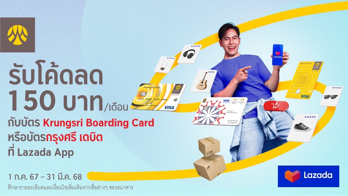 กรุงศรี (ธนาคารกรุงศรีอยุธยา จำกัด (มหาชน)) มอบสิทธิพิเศษสำหรับลูกค้าบัตร Krungsri Boarding Card หรือบัตรกรุงศรี เดบิต ทุกประเภท (รวมถึงบัตรกรุงศรี เดบิต ที่เป็นบัตรประจำตัวนักศึกษา บัตรอาจารย์ บัตรบุคลากร และบัตรพนักงาน) เมื่อช้อปที่ Lazada App และชำระค่าสินค้าหรือบริการผ่านบัตร Krungsri Boarding Card หรือบัตรกรุงศรี เดบิต รับโค้ดส่วนลดสูงสุด 150 บาทต่อเดือน ตั้งแต่วันที่ 1 กรกฎาคม 2567 – 31 มีนาคม 2568 โดยมีรายละเอียดดังนี้