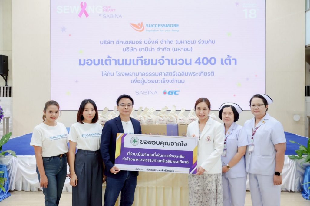บริษัท ซัคเซสมอร์ บีอิ้งค์ จำกัด (มหาชน) นำโดย คุณนพกฤษฏิ์ นิธิเลิศวิจิตร ประธานกรรมการบริหารและเจ้าหน้าที่บริหาร พร้อมด้วยพนักงานและนักธุรกิจผู้จำหน่ายอิสระ จิตอาสา ร่วมส่งต่อกำลังใจผ่านการมอบ เต้านมเทียมจำนวน 400 คู่ ให้แก่ผู้ป่วยมะเร็งเต้านม ผ่านทางโรงพยาบาลธรรมศาสตร์เฉลิมพระเกียรติ เมื่อวันที่ 28 สิงหาคม 2568 ที่ผ่านมา