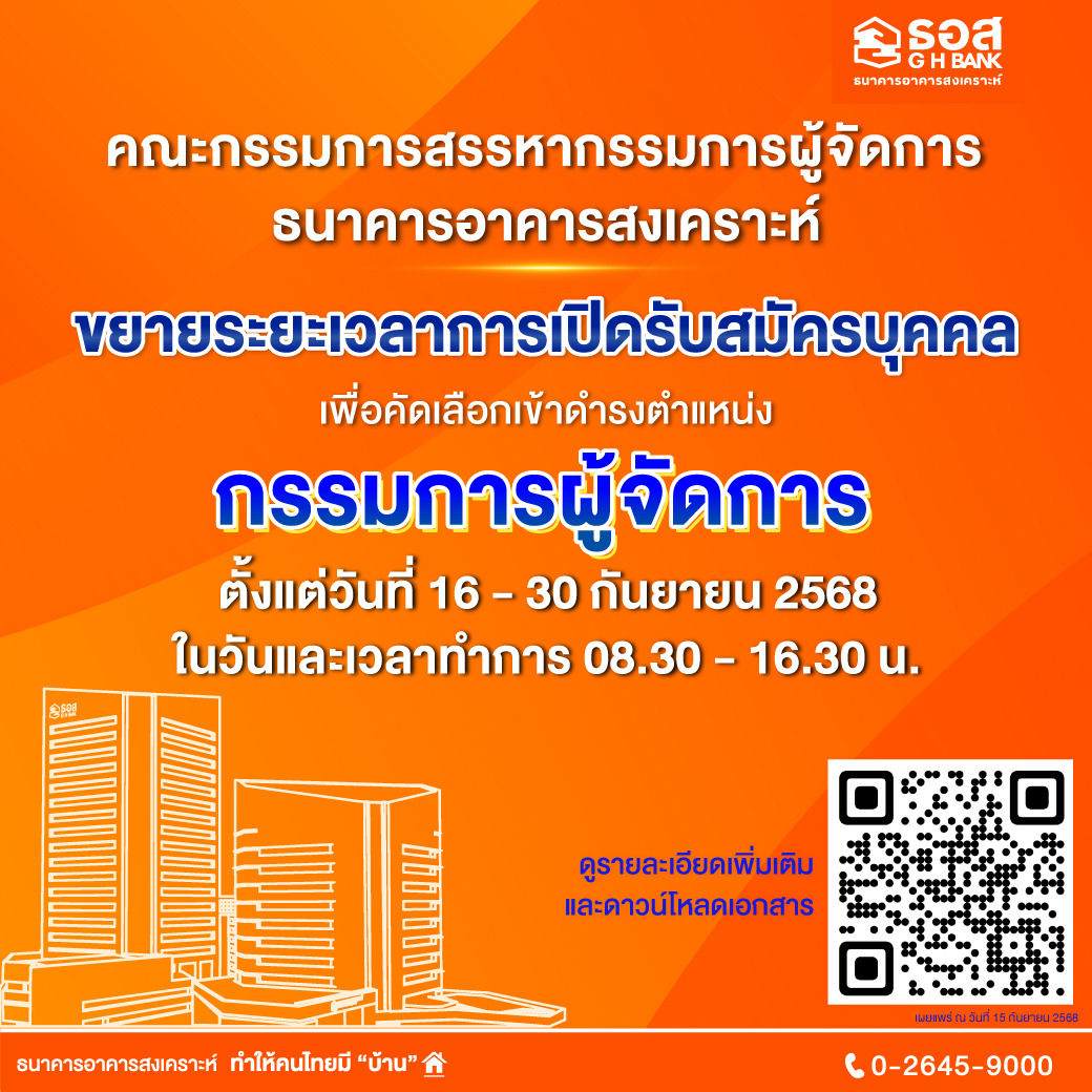 นายอนุกูล ปีดแก้ว ประธานกรรมการสรรหากรรมการผู้จัดการธนาคารอาคารสงเคราะห์ (ธอส.) เปิดเผยว่า คณะกรรมการสรรหากรรมการผู้จัดการ ธอส. มีมติขยายระยะเวลาการเปิดรับสมัครบุคคลเพื่อคัดเลือกเข้าดำรงตำแหน่ง กรรมการผู้จัดการธนาคารอาคารสงเคราะห์ ตั้งแต่วันที่ 16 – 30 กันยายน 2568