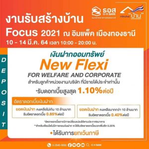 ธนาคารอาคารสงเคราะห์ (ธอส.) ขนผลิตภัณฑ์ทางการเงินให้บริการลูกค้าประชาชนที่ “งานรับสร้างบ้าน Focus 2021” พบกับสินเชื่อบ้านอัตราดอกเบี้ยพิเศษปีแรก 2.60% ต่อปี ดอกเบี้ยเฉลี่ย 3 ปีแรกเพียง 2.917% กรณีกู้ 1 ล้านบาท ผ่อนชำระเริ่มต้นแค่ 3,400 บาท/เดือนเท่านั้น พิเศษ!! ฟรีค่าธรรมเนียมการยื่นกู้   ทางด้านเงินฝากพบกับสลากออมทรัพย์ ธอส. ชุดเกล็ดดาว หน่วยละ 5,000 บาท อายุสลาก 2 ปี ได้ลุ้นรางวัลสูงสุด 1 ล้านบาททุกเดือน และเงินฝากออมทรัพย์ New Flexi for Welfare and Corporate อัตราดอกเบี้ยพิเศษสูงสุด 1.10% ต่อปี จองสิทธิ์ผลิตภัณฑ์ของธนาคารได้ในงานระหว่างวันที่ 10-14 มีนาคม 2564  ณ อิมแพ็ค เมืองทองธานี