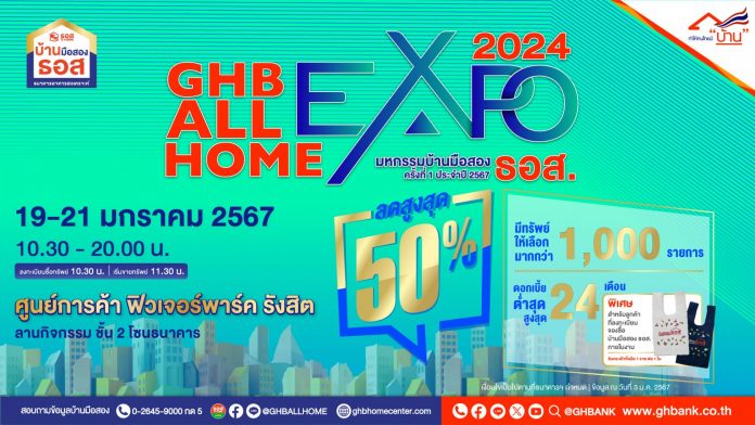 จัดงาน มหกรรมบ้านมือสอง ธอส. : GHB ALL HOME EXPO 2024 @ฟิวเจอร์พาร์ค รังสิต ระหว่างวันที่ 19-21 มกราคม 2567 ณ ศูนย์การค้าฟิวเจอร์พาร์ค รังสิต นำบ้านมือสองคุณภาพดี ทำเลเด่น และราคาคุ้มค่า