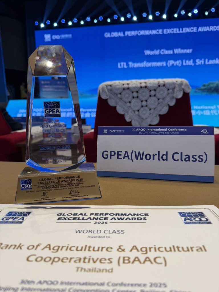 องค์กรคุณภาพแห่งเอเชียแปซิฟิก (Asia Pacific Quality Organization : APQO) ประกาศให้ ธ.ก.ส. ได้รับรางวัลสุดยอดองค์กรแห่งความเป็นเลิศระดับโลก Global Performance Excellence Award 2025