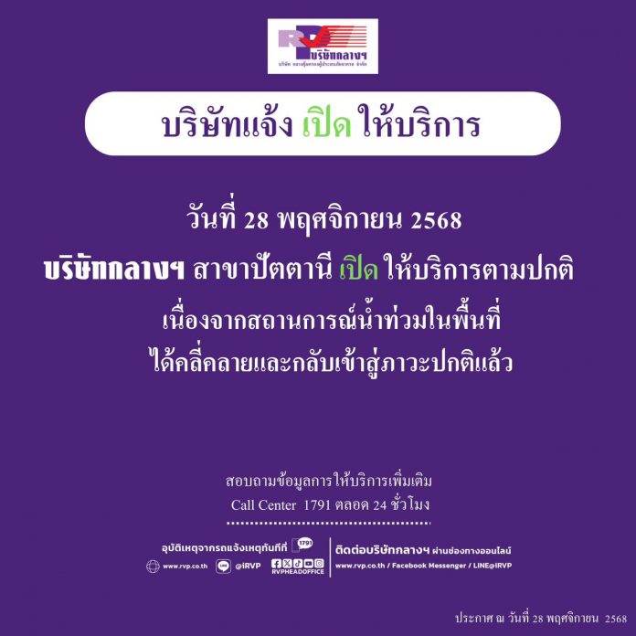 เนื่องจากเกิดเหตุการณ์น้ำท่วมบริเวณโดยรอบบริษัท กลางคุ้มครองผู้ประสบภัยจากรถ จำกัด สาขาปัตตานี ซึ่งส่งผลกระทบจนไม่สามารถเปิดให้บริการได้ ขณะนี้สถานการณ์ดังกล่าวได้กลับสู่ภาวะปกติ โดยบริษัทสามารถให้บริการประชาชนรวมทั้งหน่วยงานต่างๆ ที่เกี่ยวข้องได้อย่างปกติ ในวันที่ 28 พฤศจิกายน 2568 เป็นต้นไป