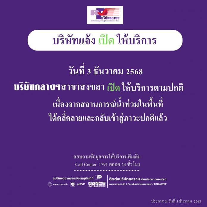 “บ.กลางฯ สงขลา กลับมาเปิดให้บริการตามปกติ 3 ธ.ค. 2568 หลังน้ำท่วมคลี่คลาย”