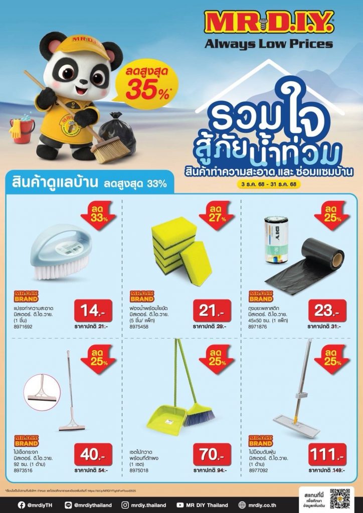 มิสเตอร์. ดี.ไอ.วาย. ผู้นำธุรกิจค้าปลีกอุปกรณ์ตกแต่งบ้านและสินค้าไลฟ์สไตล์ เดินหน้าช่วยเหลือผู้ประสบอุทกภัยภาคใต้ต่อเนื่อง โดยจัดโปรโมชัน ‘รวมใจสู้ภัยน้ำท่วม’ ลดราคาสินค้าทำความสะอาดและสินค้าซ่อมแซมบ้านสูงสุด 35%(1) รวม 12 รายการ เพื่อบรรเทาภาระค่าใช้จ่ายของผู้ประสบอุทกภัยในพื้นที่ภาคใต้ในช่วงที่สถานการณ์น้ำท่วมเริ่มคลี่คลายและก้าวสู่ระยะฟื้นฟู ขณะเดียวกันลูกค้าทั่วประเทศที่ต้องการซื้อสินค้าเพื่อนำไปบริจาคช่วยผู้ประสบภัยในภาคใต้ก็ยังสามารถเลือกซื้อสินค้าได้ ณ ร้านมิสเตอร์. ดี.ไอ.วาย. ทุกสาขาทั่วประเทศ(2) ตั้งแต่วันที่ 3 ธันวาคม 2568 ถึง 31 ธันวาคม 2568