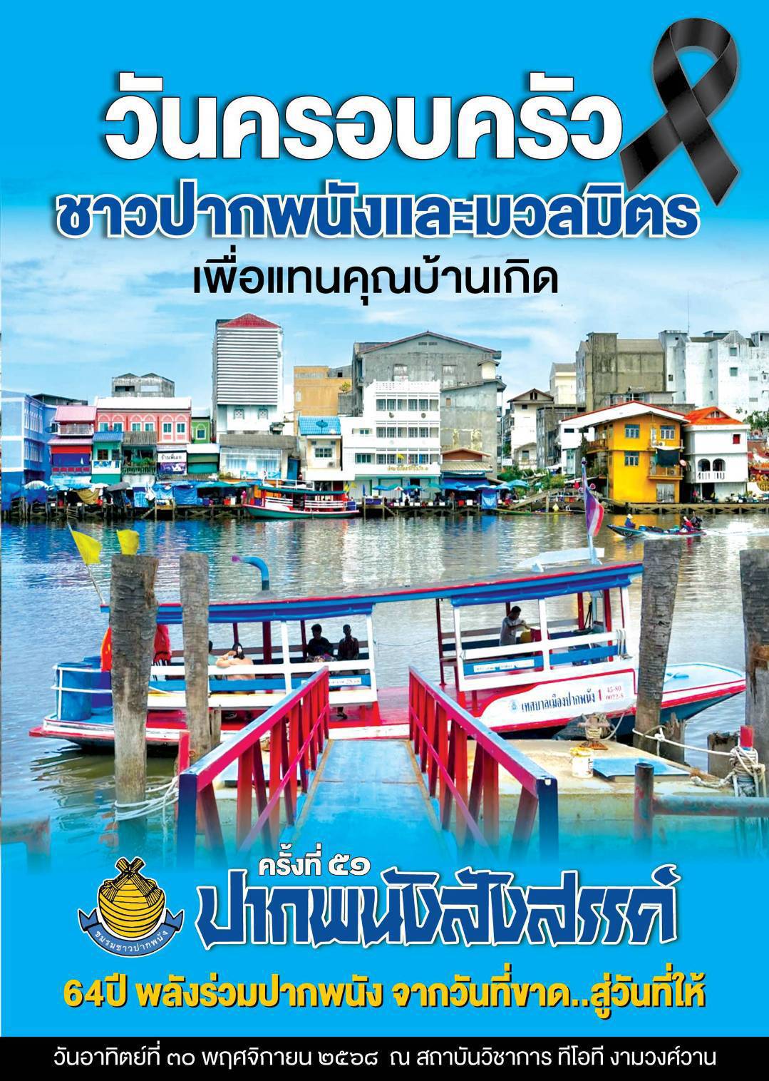 มูลนิธิชมรมชาวปากพนัง จัดงานวันครอบครัวชาวปากพนังและมวลมิตร”ปากพนังสังสรรค์”ครั้งที่ 51 ประจำปี2568 เพื่อระดมทุนการศึกษาให้กับนักเรียน ในวันอาทิตย์ที่ 30 พฤศจิกายน 2568 ที่สถาบันวิชาการทีโอที งามวงศ์วาน 17 นนทบุรี เวลา 11.00-16.00 น.