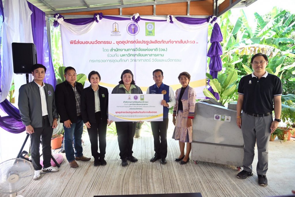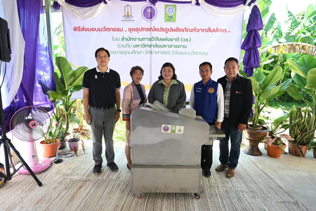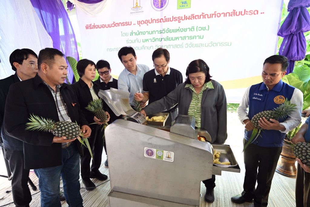 วันที่ 10 ตุลาคม 2568 สำนักงานการวิจัยแห่งชาติ(วช.) กระทรวงการอุดมศึกษา วิทยาศาสตร์ วิจัยและนวัตกรรม ร่วมกับ มหาวิทยาลัยมหาสารคาม นำนวัตกรรมเพื่อการแปรรูปผลิตภัณฑ์สัปปะรด ส่งมอบกลุ่มวิสาหกิจชุมชนกลุ่มผู้ปลูกสัปปะรดและแปรรูปบ้านโคกนาดี จ.นครพนม โดยมี ดร.วิภารัตน์ ดีอ่อง ผู้อำนวยการสำนักงานการวิจัยแห่งชาติ เป็นประธานในการส่งมอบนวัตกรรม พร้อมด้วย นายโกวิท อิ่มเต็ม ปลัดอำเภอโพนสวรรค์ กล่าวต้อนรับ รองศาสตราจารย์ ดร. จักรมาส เลาหวณิช หัวหน้าโครงการวิจัย คณะวิศวกรรมศาสตร์ มหาวิทยาลัยมหาสารคาม กล่าวรายงาน และผู้บริหารในท้องถิ่นพื้นที่ จ.นครพนม ณ วิสาหกิจชุมชนกลุ่มผู้ปลูกสับปะรดและแปรรูปบ้านโคกนาดี อ.โพนสวรรค์ จ.นครพนม