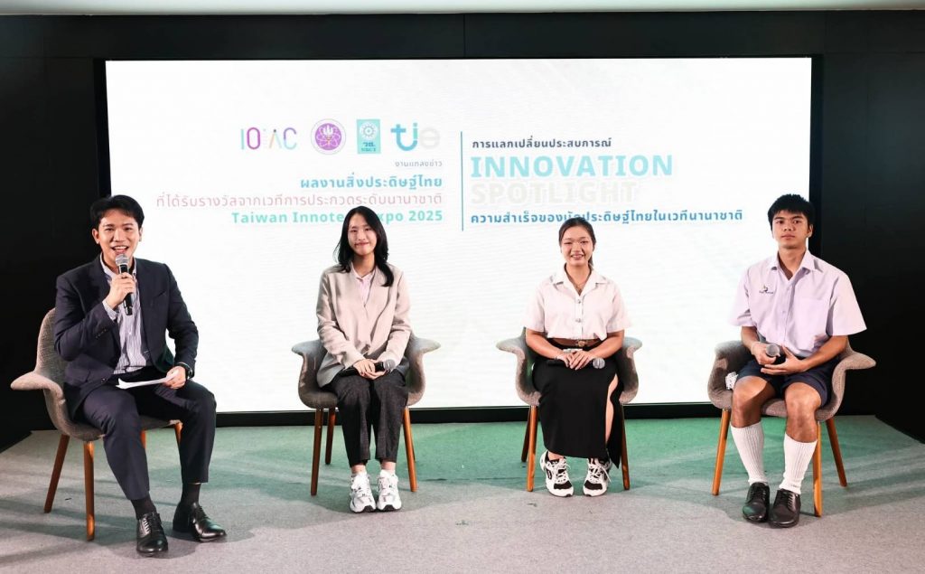 ถัดมาเป็นการเสวนาในหัวข้อ “Innovation Spotlight: ความสำเร็จของนักประดิษฐ์ไทยในเวทีนานาชาติ” โดยผู้ได้รับรางวัลจากการประกวดสิ่งประดิษฐ์และนวัตกรรมจากเวที TIE 2025 โดยมี