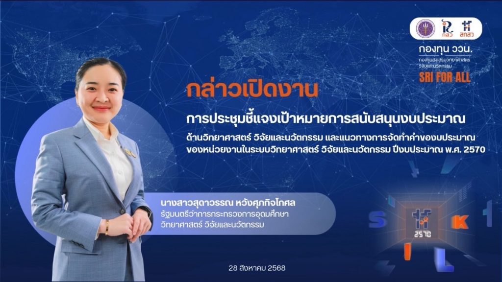 เมื่อวันที่ 28 สิงหาคม 2568 กระทรวงการอุดมศึกษา วิทยาศาสตร์ วิจัยและนวัตกรรม (อว.) โดยสำนักงานคณะกรรมการส่งเสริมวิทยาศาสตร์ วิจัยและนวัตกรรม (สกสว.) จัดการประชุมชี้แจงเป้าหมายการสนับสนุนงบประมาณด้านวิทยาศาสตร์ วิจัยและนวัตกรรม และแนวทางการจัดทำคำของบประมาณของหน่วยงานในระบบวิทยาศาสตร์ วิจัยและนวัตกรรม ปีงบประมาณ พ.ศ.2570 ณ โรงแรมดิ แอทธินี โฮเทล แบงค็อก