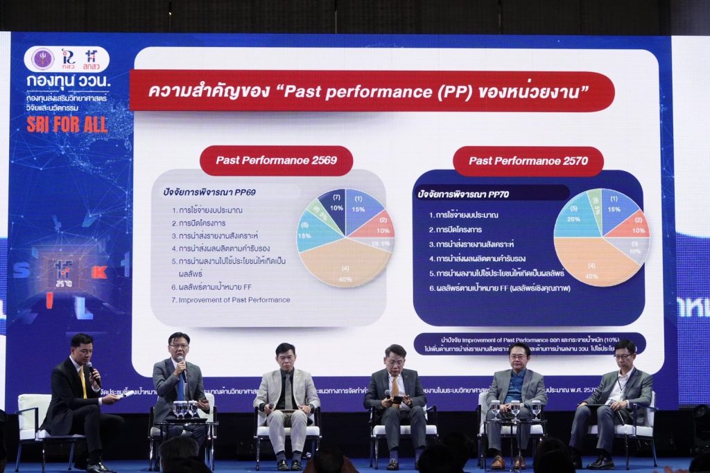 ด้าน ศาสตราจารย์ ดร.นพ.สิริฤกษ์ ทรงศิวิไล ประธานกรรมการส่งเสริมวิทยาศาสตร์ วิจัยและนวัตกรรม (กสว.) กล่าวว่า กสว. ให้ความสำคัญต่อการจัดสรรงบประมาณ ววน. อย่างมีประสิทธิภาพ โดยยึดหลักตอบโจทย์ยุทธศาสตร์ชาติและสร้างผลลัพธ์เชิงรูปธรรม ทั้งนี้ การจัดทำงบประมาณปี 2570 จะเน้นการสนับสนุนผ่านกองทุนส่งเสริมวิทยาศาสตร์ วิจัยและนวัตกรรม (กองทุน ววน.) ด้วยรูปแบบการสนับสนุนที่หลากหลาย อาทิ การจัดสรรแบบ Multi-year และ Block Grant ควบคู่กับการส่งเสริมบุคลากรวิจัยรุ่นใหม่ และการสร้างเครือข่ายความร่วมมือทั้งในและต่างประเทศ เพื่อผลักดันให้งานวิจัยนำไปใช้ประโยชน์ได้จริง และสร้างมูลค่าเพิ่มให้กับประเทศ โดยงบประมาณที่กองทุน ววน. ได้รับจัดสรรประมาณ 20,000 ล้านบาทต่อปี