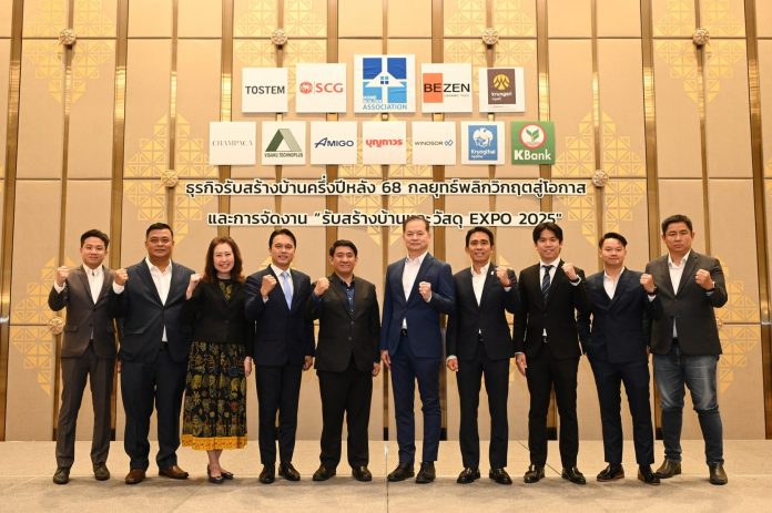 นายอนันต์กร อมรวาที (ที่ 5 จากขวา) นายกสมาคมธุรกิจรับสร้างบ้าน (HBA : Home Builder Association) นำทัพคณะกรรมการบริหารสมาคมฯ จัดงานแถลงข่าวเผยทิศทางตลาดรับสร้างบ้านครึ่งปีหลัง 2568 รับ ‘6 แรงส่ง’ หนุนตลาดพลิกจากติดลบสู่ ‘ภาวะฟื้นตัว’ พร้อมเดินหน้าจัดงานรับสร้างบ้านและวัสดุ EXPO 2025 ภายใต้แนวคิด “สร้าง อยู่ ดี” กระตุ้นตลาด ซึ่งเป็นงานใหญ่งานสุดท้ายปี ระหว่างวันที่ 10 – 14 กันยายน 2568 ที่ อิมแพ็ค เมืองทองธานี ฮอลล์ 6 โดยงานแถลงข่าวจัดขึ้น ณ ห้องสยามฮอลล์ ชั้น 6 อีสติน แกรนด์ พญาไท เมื่อเร็ว ๆ นี้