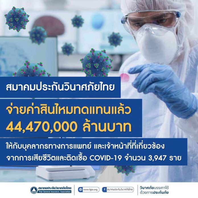 สมาคมประกันวินาศภัยไทย จ่ายค่าสินไหมทดแทนให้กับบุคลากรทางการแพทย์ และเจ้าหน้าที่ ที่เกี่ยวข้อง กรณีเสียชีวิตและติดเชื้อจากโรค COVID-19 ตามโครงการประกันภัยคุ้มครองโรคติดเชื้อไวรัส โคโรนา 2019 (COVID-19) แบบกลุ่ม สำหรับบุคลาการทางการแพทย์ และเจ้าหน้าที่ที่เกี่ยวข้อง ของกระทรวงสาธารณสุข โดยข้อมูลล่าสุด ณ วันที่ 25 มกราคม 2565 สมาคมฯ ได้จ่ายค่าสินไหมทดแทนให้กับผู้เอาประกันภัยไปแล้วจำนวน 3,947 ราย คิดเป็นเงินรวม 44,470,000 ล้านบาท