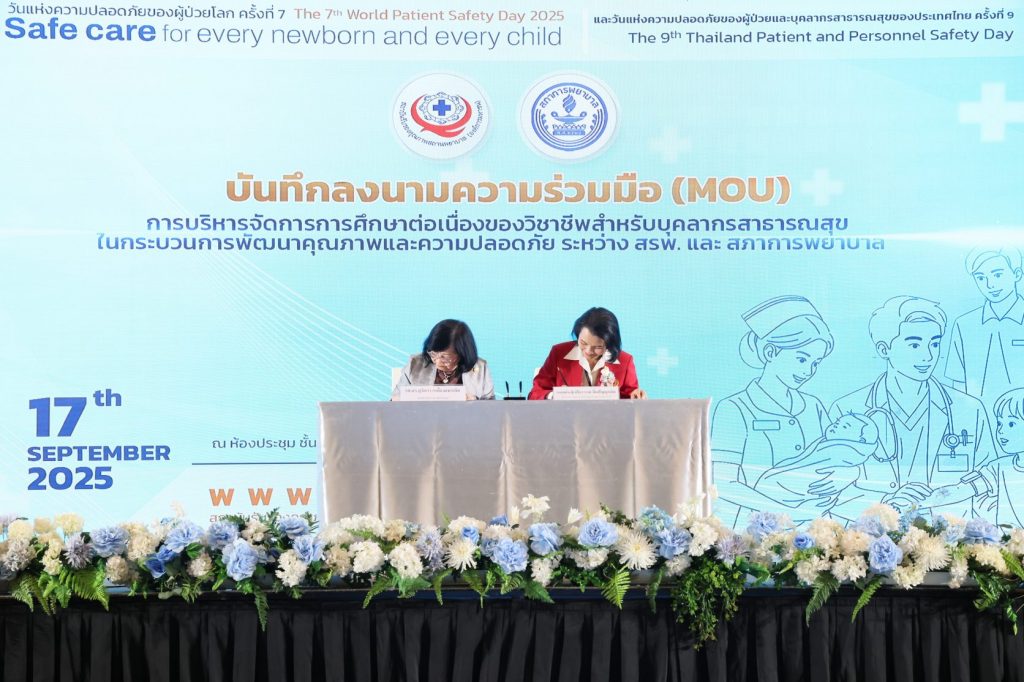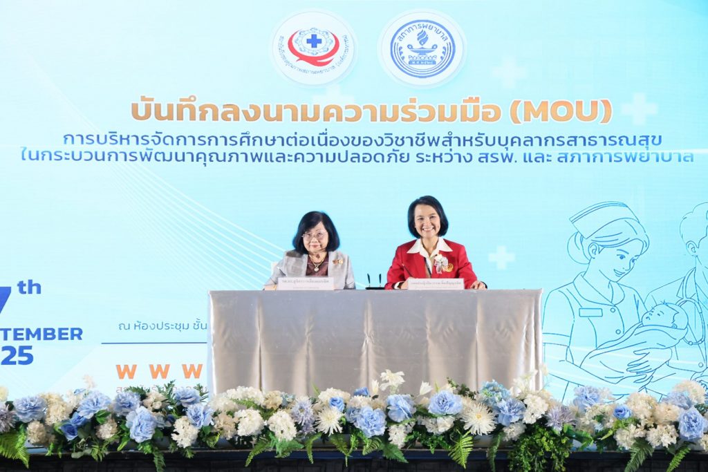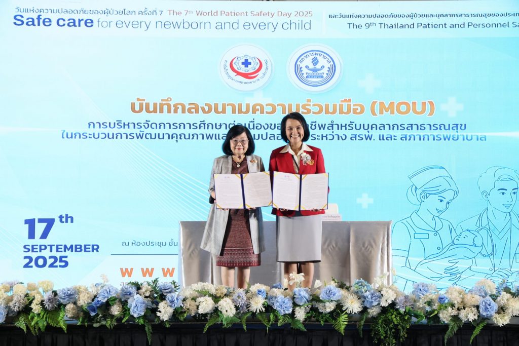 สถาบันรับรองคุณภาพสถานพยาบาล (องค์การมหาชน) หรือ สรพ. และ สภาการพยาบาล จัดพิธีบันทึกข้อตกลงความร่วมมือ (MOU) การบริหารจัดการการศึกษาต่อเนื่องของวิชาชีพสำหรับบุคลากรสาธารณสุขในกระบวนการพัฒนาคุณภาพและความปลอดภัย โดยมี รศ.ดร.สุจิตรา เหลืองอมรเลิศ นายกสภาการพยาบาล และ พญ.ปิยวรรณ ลิ้มปัญญาเลิศ ผู้อำนวยการ สรพ. เป็นผู้แทนของทั้ง 2 หน่วยงานในการลงนาม เมื่อวันที่ 17 กันยายน 2568 ณ โรงแรมอัศวิน แกรนด์ คอนเวนชั่น หลักสี่ กรุงเทพฯ