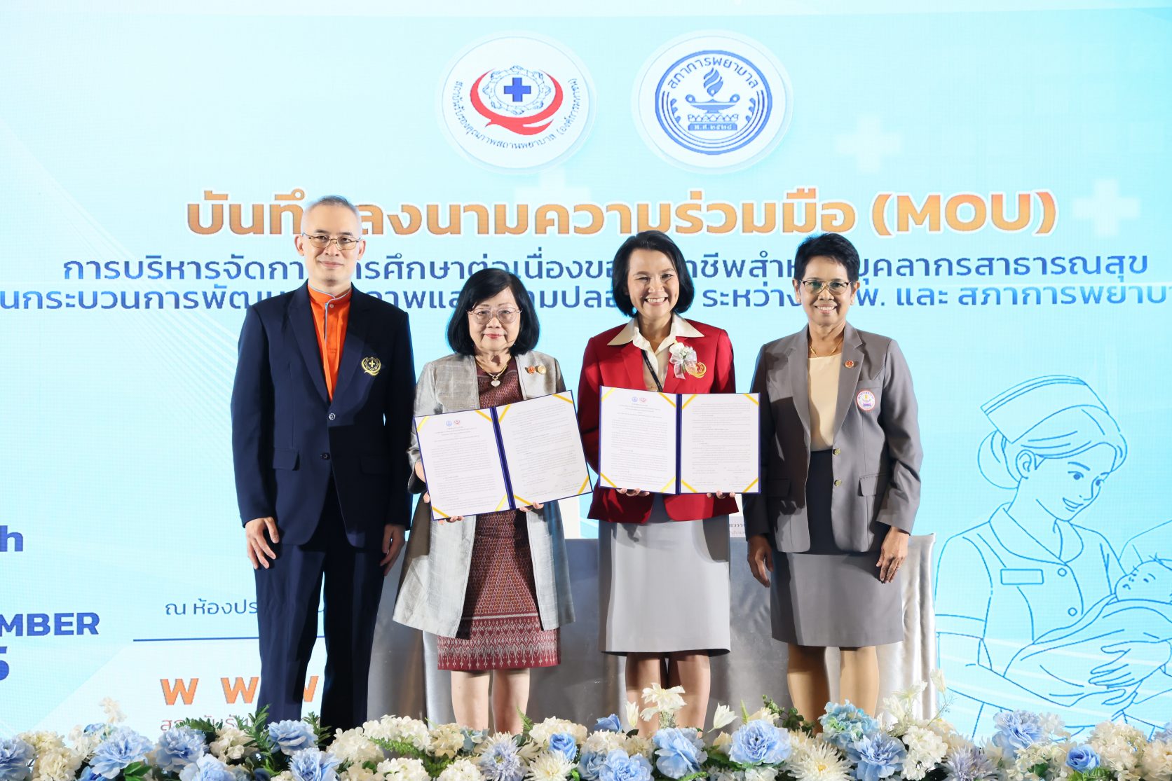 สถาบันรับรองคุณภาพสถานพยาบาล (องค์การมหาชน) หรือ สรพ. และ สภาการพยาบาล จัดพิธีบันทึกข้อตกลงความร่วมมือ (MOU) การบริหารจัดการการศึกษาต่อเนื่องของวิชาชีพสำหรับบุคลากรสาธารณสุขในกระบวนการพัฒนาคุณภาพและความปลอดภัย โดยมี รศ.ดร.สุจิตรา เหลืองอมรเลิศ นายกสภาการพยาบาล และ พญ.ปิยวรรณ ลิ้มปัญญาเลิศ ผู้อำนวยการ สรพ. เป็นผู้แทนของทั้ง 2 หน่วยงานในการลงนาม เมื่อวันที่ 17 กันยายน 2568 ณ โรงแรมอัศวิน แกรนด์ คอนเวนชั่น หลักสี่ กรุงเทพฯ