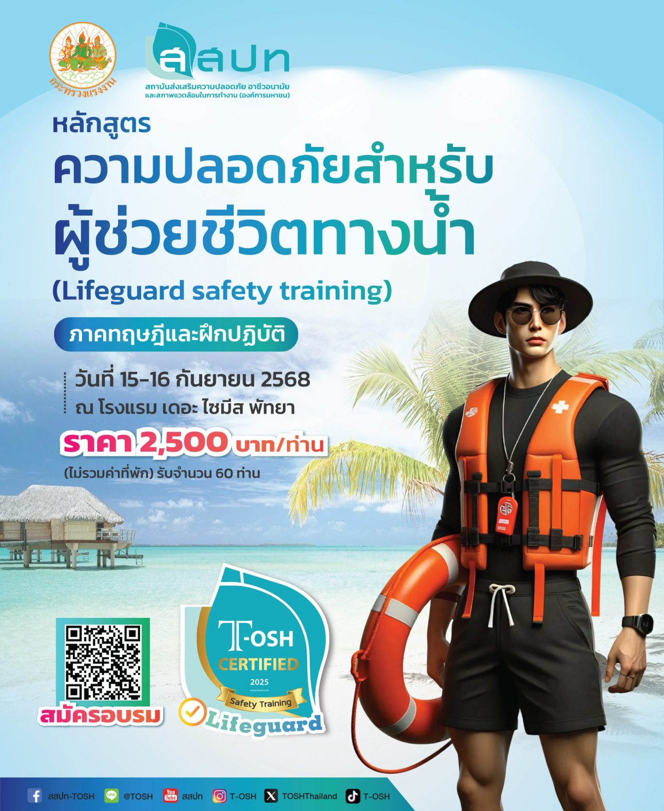 โดยกำหนดจัดอบรมหลักสูตร “ความปลอดภัยสำหรับผู้ช่วยชีวิตทางน้ำ (Lifeguard Safety Training)” รุ่นที่ 1 จะจัดขึ้นระหว่างวันที่ 15–16 กันยายน 2568 ณ โรงแรมเดอะ ไซมีส พัทยา จังหวัดชลบุรี ผู้สนใจสามารถสมัครเข้าร่วมได้ที่ https://eservice.tosh.or.th/seminar/rtEKxkYLi3CQT2haoGxxrW6066ckdc หรือสอบถามรายละเอียดเพิ่มเติมได้ตามช่องทางที่กำหนด ทั้งนี้ การอบรมครั้งนี้ถือเป็นโอกาสสำคัญในการพัฒนาทักษะด้านความปลอดภัยทางน้ำ และเสริมสร้างความเชื่อมั่นให้กับนักท่องเที่ยวในพื้นที่พัทยาและจังหวัดใกล้เคียง