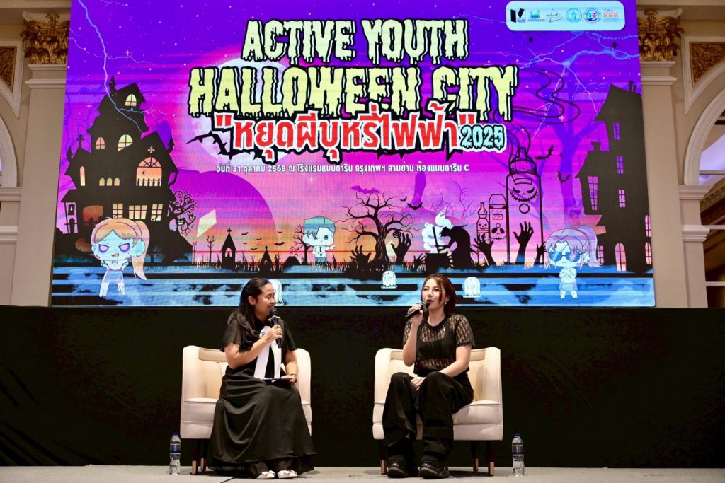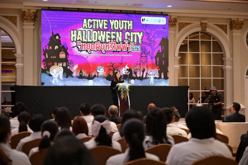 เมื่อเวลา 13.00 น. วันที่ 31 ต.ค. 2568 ที่โรงแรมแมนดาริน สามย่าน สำนักงานกองทุนสนับสนุนการสร้างเสริมสุขภาพ (สสส.) ร่วมกับ เครือข่ายเยาวชนลดปัจจัยเสี่ยง สำนักป้องกันและบำบัดการติดยาเสพติด สำนักอนามัย กรุงเทพมหานคร มูลนิธิเด็ก เยาวชน และครอบครัว จัดกิจกรรมรณรงค์เทศกาลฮาโลวีนประจำปี 2568 Active Youth “Halloween city หยุดผีบุหรี่ไฟฟ้า” เพื่อสร้างความตระหนัก และลดการใช้บุหรี่ไฟฟ้าในกลุ่มเด็กและเยาวชน โดยก่อนเริ่มกิจกรรมภาคีเครือข่ายซึ่งสวมชุดดำได้ร่วมยืนสงบนิ่ง น้อมถวายความอาลัยสมเด็จพระนางเจ้าสิริกิติ์ พระบรมราชินีนาถ พระบรมราชชนนีพันปีหลวง