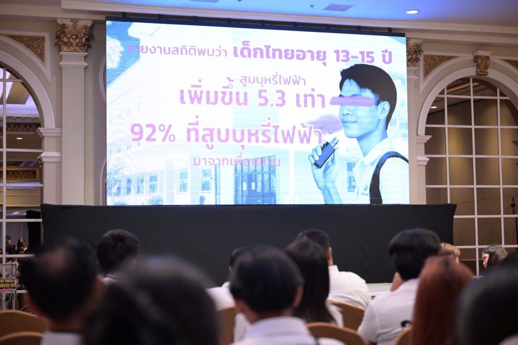 นางสาวรุ่งอรุณ ลิ้มฬหะภัณ ผู้อำนวยการสำนักสนับสนุนการควบคุมปัจจัยเสี่ยงหลัก สสส. กล่าวว่า ไทยเผชิญปัญหาการแพร่ระบาดของบุหรี่ไฟฟ้า โดยเฉพาะกลุ่มเด็กและเยาวชนที่เป็นกลุ่มเป้าหมายหลักของธุรกิจบุหรี่ไฟฟ้า ข้อมูลจากสำนักงานสถิติแห่งชาติล่าสุด ปี 2567 พบคนไทยสูบบุหรี่ไฟฟ้าสูงขึ้น 11.44 เท่า จากปี 2564 ที่มีผู้สูบบุหรี่ไฟฟ้า 78,742 คน เพิ่มเป็น 900,459 คน ในปี 2567 เป็นกลุ่มเด็กและเยาวชนอายุ 15-24 ปี มากถึง 251,625 คน ซึ่งขณะนี้มีบุหรี่ไฟฟ้ารูปแบบใหม่ พร้อมใช้กลยุทธ์การตลาดผ่านสื่อออนไลน์ เข้าถึงและจูงใจให้เยาวชนอยากลองใช้ 1.ทอยพอด บุหรี่ไฟฟ้ารูปลักษณ์คล้ายของเล่น หรือตุ๊กตา 2.พอดจมูก สูบผ่านจมูกคล้ายยาดม 3.นิโคตินพาวช์ (Nicotine Pouch) หรือถุงซองนิโคติน ใช้เหน็บไว้ระหว่างเหงือกกับริมฝีปาก 4.พอดเค บุหรี่ไฟฟ้าแปลงร่างเป็นยาเสพติด ที่เปลี่ยนหัวพอดเป็นน้ำยาผสมเคตามีน หรือยาสลบ สูบแล้วเคลิ้มฝัน เมา มีผลกระทบต่อสุขภาพรุนแรงเช่น ประสาทหลอน นำไปสู่โรคจิตเภท ทำให้กล้ามเนื้อขาดออกซิเจน อาจหมดสติ และเสียชีวิตได้ นอกจากนี้ สารนิโคตินในบุหรี่ไฟฟ้ามีอันตราย ส่งผลต่อพัฒนาการสมอง เพิ่มความเสี่ยงโรคปอดอักเสบรุนแรง และภาวะซึมเศร้า