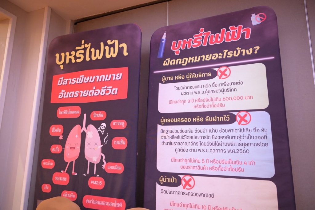 นายเลิศศักดิ์ รักธรรม ผู้อำนวยการสำนักงานคุ้มครองผู้บริโภค 3 สำนักงานคณะกรรมการคุ้มครองผู้บริโภค (สคบ.) กล่าวว่า สคบ. ในฐานะเจ้าของกฎหมายห้ามผลิต น้ำเข้า จำหน่ายบุหรี่ไฟฟ้า น้ำยาบุหรี่ไฟฟ้า ที่ถือเป็นสินค้าที่กระทบสิทธิผู้บริโภค ทำลายสุขภาพทั้งคนสูบ และคนไม่สูบ ที่ผ่านมา สคบ. ร่วมกับหน่วยงานที่เกี่ยวข้องจับกุมผู้กระทำความผิดเกี่ยวกับบุรี่ไฟฟ้ามากว่า 200 คดี คิดเป็นมูลค่าของกลางมากกว่า 1,000 ล้านบาท แม้รัฐบาลมีนโยบายเร่งด่วน ให้ความสำคัญทุกภาคส่วนเร่งป้องกันและปราบปราม ทำให้ขณะนี้สถานการณ์ดีขึ้น ไม่มีการซื้อขายหน้าร้านที่เด็กเข้าถึงง่าย แต่มีการหลบไปขายผ่านออนไลน์มากขึ้น ทำให้ยากต่อการไล่ตรวจจับ โดยเฉพาะออนไลน์จากต่างประเทศ เพราะใช้อำนาจสั่งปิดเว็บไซต์ หรือแอคเคาท์ยาก ต้องขออนุญาตหลายขั้นตอน ทั้งนี้ สคบ. จึงได้ประสานหลายภาคส่วน เพื่อขอความร่วมมือในการปิดกั้นการขายบุหรี่ไฟฟ้า เช่น บริษัทขนส่ง แพลตฟอร์มออนไลน์