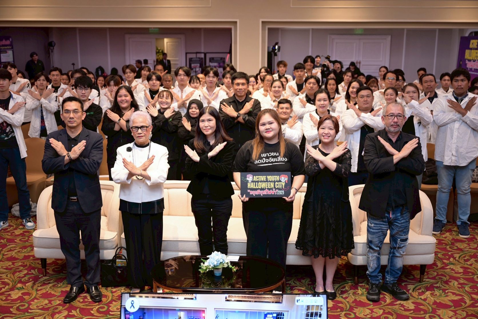 เมื่อเวลา 13.00 น. วันที่ 31 ต.ค. 2568 ที่โรงแรมแมนดาริน สามย่าน สำนักงานกองทุนสนับสนุนการสร้างเสริมสุขภาพ (สสส.) ร่วมกับ เครือข่ายเยาวชนลดปัจจัยเสี่ยง สำนักป้องกันและบำบัดการติดยาเสพติด สำนักอนามัย กรุงเทพมหานคร มูลนิธิเด็ก เยาวชน และครอบครัว จัดกิจกรรมรณรงค์เทศกาลฮาโลวีนประจำปี 2568 Active Youth “Halloween city หยุดผีบุหรี่ไฟฟ้า” เพื่อสร้างความตระหนัก และลดการใช้บุหรี่ไฟฟ้าในกลุ่มเด็กและเยาวชน โดยก่อนเริ่มกิจกรรมภาคีเครือข่ายซึ่งสวมชุดดำได้ร่วมยืนสงบนิ่ง น้อมถวายความอาลัยสมเด็จพระนางเจ้าสิริกิติ์ พระบรมราชินีนาถ พระบรมราชชนนีพันปีหลวง