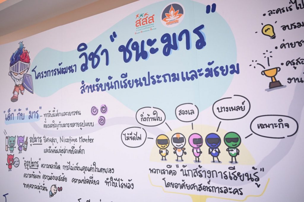 นพ.พงศ์เทพ กล่าวต่อว่า สสส. สนับสนุนโครงการ “ชนะมาร” ต่อเนื่องเป็นปีที่ 2 นำกระบวนการเรียนรู้ผ่านศาสตร์และศิลป์ของ “ละครเพื่อการเรียนรู้” ร่วมกับการพัฒนา “คู่มือครูชนะมาร” เป็นแนวทางให้ครูนำไปสร้างภูมิรู้เท่าทันปัจจัยเสี่ยงให้กับนักเรียน ผ่านการจำลองสถานการณ์ ฝึกคิด วิเคราะห์ และแก้ปัญหา มุ่งส่งเสริมความรอบรู้ทางสุขภาวะ ให้เกิดสุขภาวะที่ดีจากภายในจิตใจสู่ โครงการปีที่ 1 มีโรงเรียนเข้าร่วมทั้งหมด 200 แห่งทั่วประเทศ ส่งต่อคู่มือชนะมารถึงมือครูกว่า 200 คน และสนับสนุนนักเรียนแกนนำไม่น้อย 500 คน ให้เป็น “นักสื่อสารสุขภาวะ” บอกต่อความรู้ต่อเพื่อน ๆ สสส. เล็งเห็นว่าโครงการนี้สามารถนำไปบูรณาการในระบบการศึกษาและช่วยตอบตัวชี้วัดของสถานศึกษาได้หลายโครงการ เช่น โครงการ To Be Number One โครงการสถานศึกษาสีขาว โครงการเรียนดีมีสุข โครงการโรงเรียนส่งเสริมสุขภาพ และโครงการโรงเรียนปลอดบุหรี่ ถือเป็นการขับเคลื่อนงานเชิงรุก ช่วยเพิ่มประสิทธิภาพการทำงานและส่งเสริมศักยภาพครูและนักเรียนแกนนำ สร้างการเปลี่ยนแปลงเชิงพฤติกรรมของเด็กและเยาวชนอย่างยั่งยืน