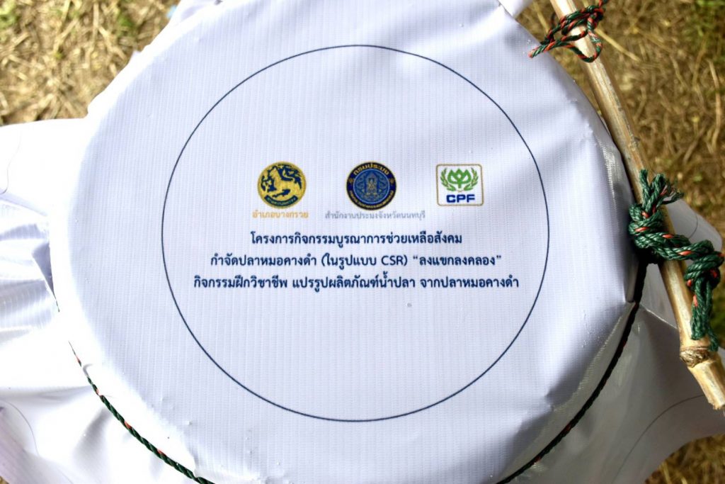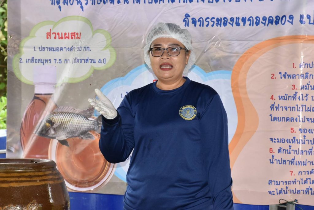 กิจกรรมเริ่มต้นด้วยการลงเรือสำรวจและจับปลาหมอคางดำด้วยวิธีหว่านแห บริเวณคลองปลายบาง ตำบลศาลากลาง อำเภอบางกรวย ซึ่งเป็นพื้นที่ที่พบการระบาดของปลาหมอคางดำ จากนั้น มีวิทยากรมาถ่ายทอดองค์ความรู้ด้านการแปรรูปผลิตภัณฑ์น้ำปลา โดยใช้ปลาหมอคางดำเป็นวัตถุดิบสำคัญ ผ่านกระบวนการหมักกับเกลือสมุทร ในอัตราส่วน ปลา 4 ส่วน : เกลือ 1 ส่วน บรรจุในโอ่งดินเผา หมักไว้เป็นเวลา 12 เดือน จะได้น้ำปลาคุณภาพดี สีใส กลิ่นหอม และรสชาติกลมกล่อม สามารถสร้างมูลค่าเพิ่มให้กับผลผลิตที่จับได้